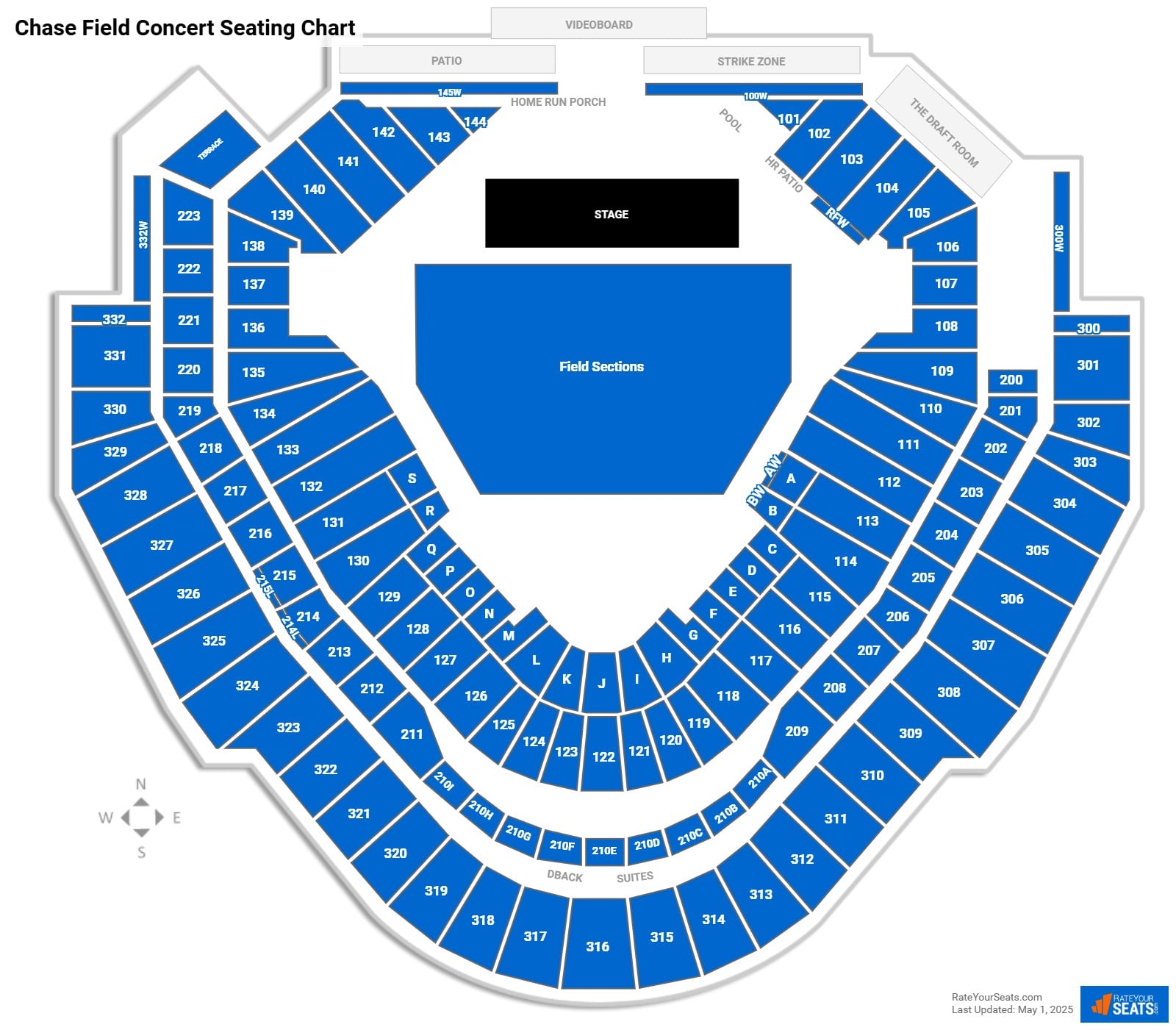 Chase Field hosts a number of different events, including Diamondbacks games, football games and concerts. These events each have a different seating chart. Select one of the maps to explore an interactive seating chart of Chase Field.