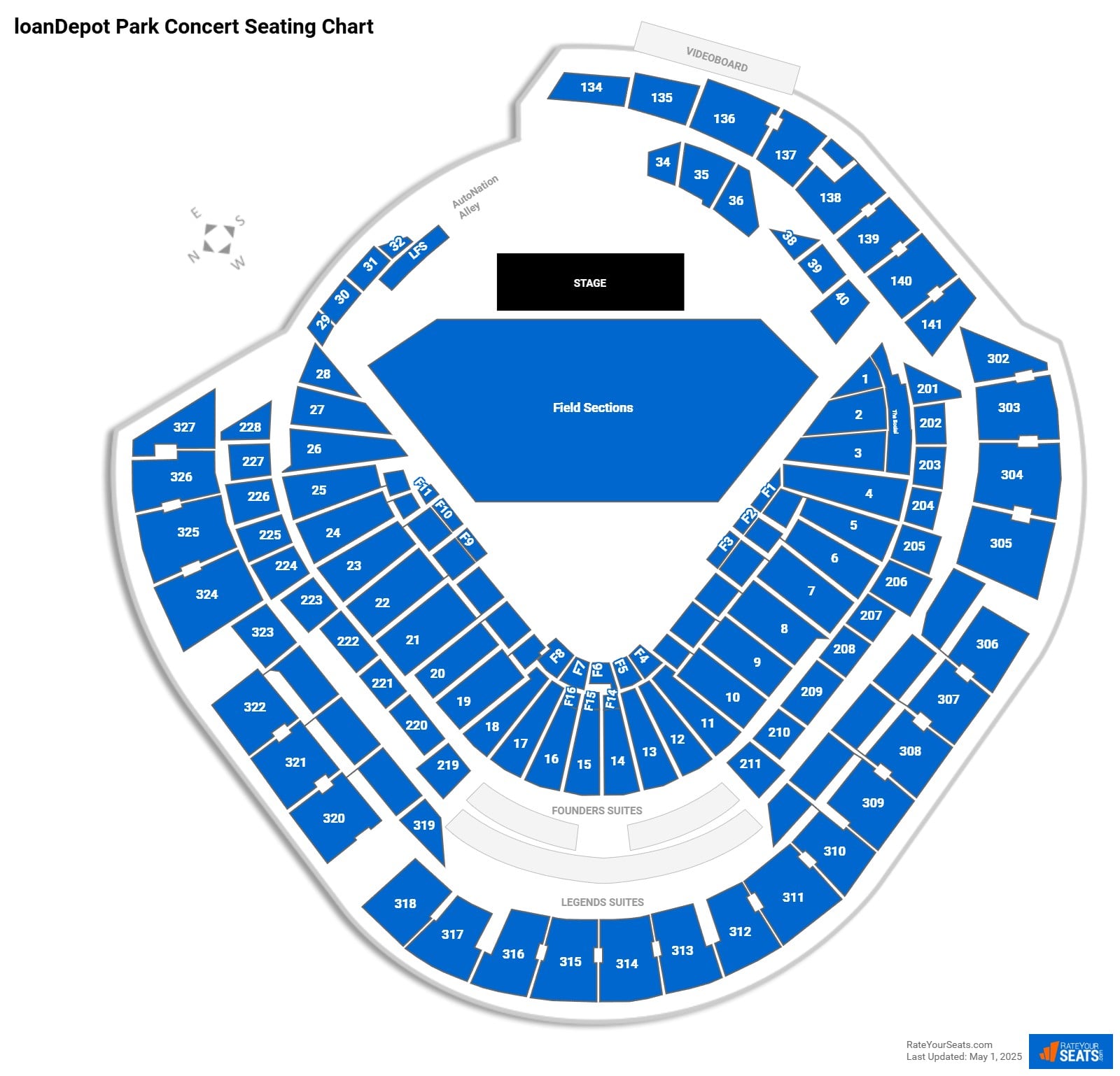 loanDepot Park hosts a number of different events, including Marlins games, football games and concerts. These events each have a different seating chart. Select one of the maps to explore an interactive seating chart of loanDepot Park.