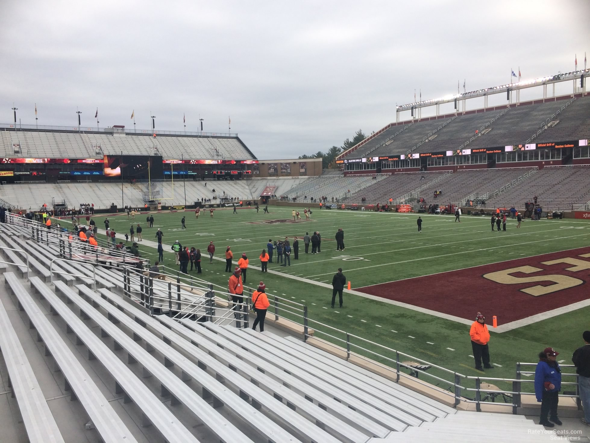 -Lower Level sideline sections at Alumni Stadium contain up to 30 rows per sections. Sections C-E are directly behind the BC sideline and offer some of the best views from midfield. On the opposite side of the field, the visiting team sits in front of sections Q, R and S. The visiting team side is the sunny side of the field, though relief can sometimes be found in Rows 35 and higher. Rows 15-25 provide an ideal height for viewing the field from the sideline seats.