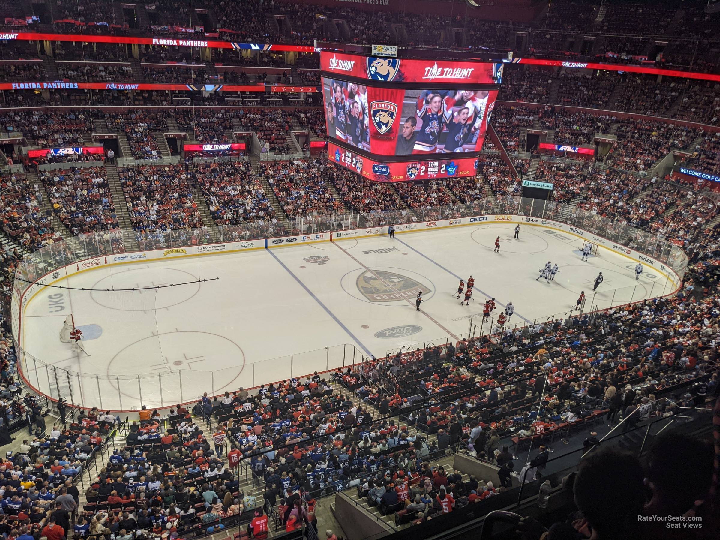 -Upper level corner seats will have some of the furthest views for a Panthers hockey game. But given the less desirable viewing, these seats are also the best place to find cheap tickets for an upcoming game. Entry tunnels are located just above row 2, and each section has no more than 16 numbered rows of seating in each. Panthers fans will want to search in Sections 321-324 and 331-333 as these corners are closest to the net where the home team shoots twice.