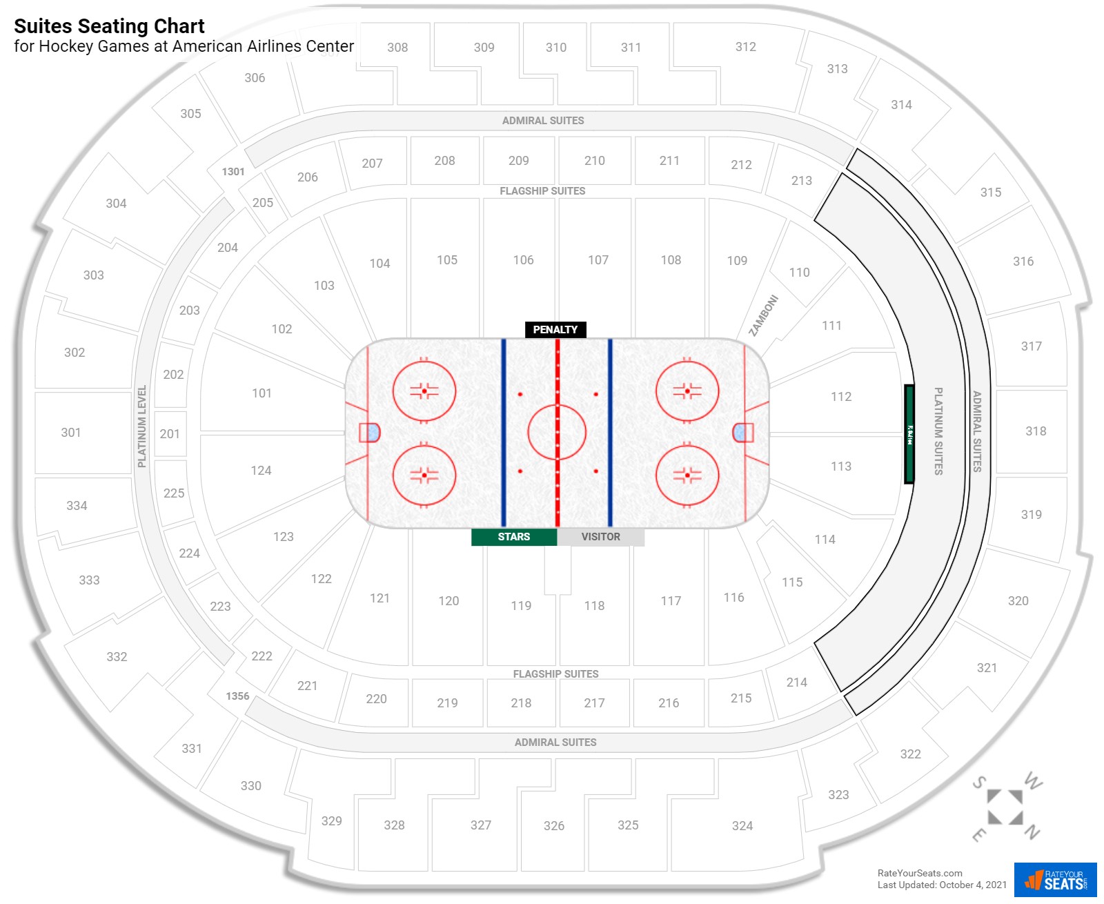 There are three different tiers of suite seating for all events at the American Airlines Center. Located just above the 100 level seats and closest to the Plaza Level are the Flagship Suites, which wrap around the entire arena.
