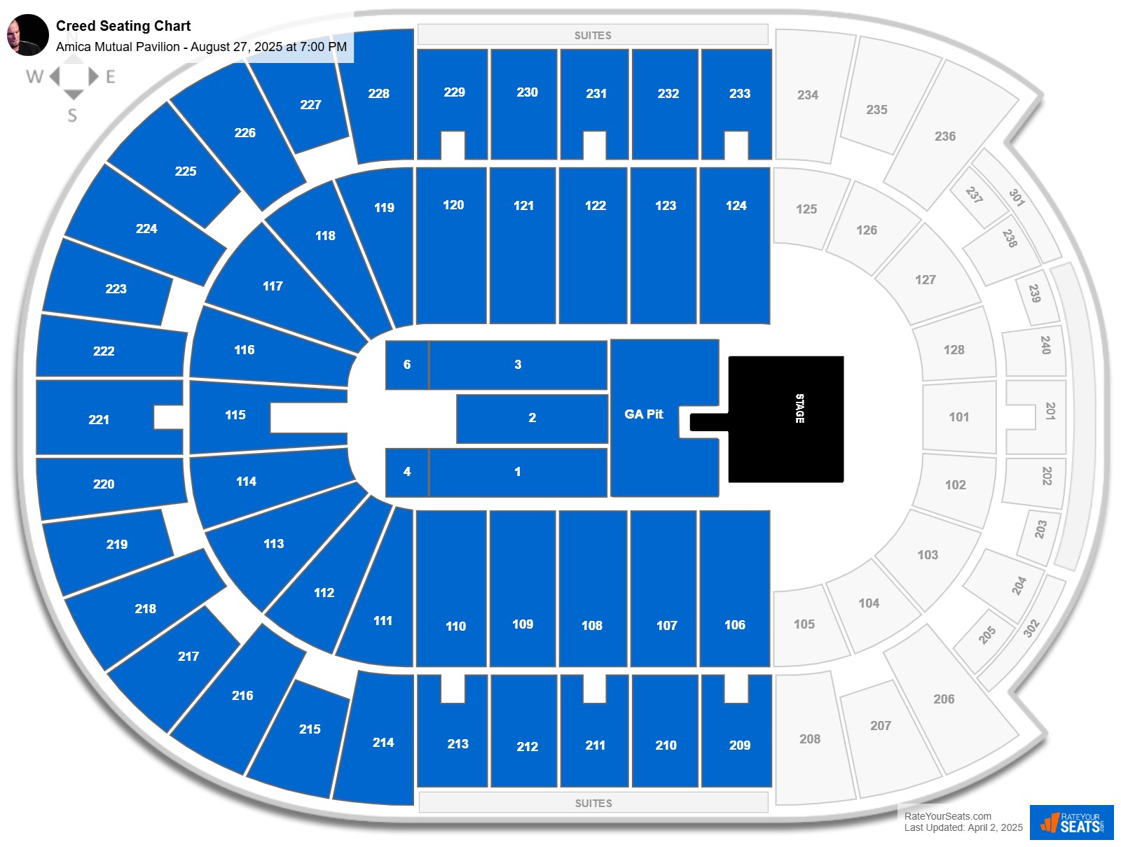 Amica Mutual Pavilion concert seating charts vary by performance. This chart represents the most common setup for end-stage concerts at Amica Mutual Pavilion, but some sections may be removed or altered for individual shows. Check out the seating chart for your show for the most accurate layout.