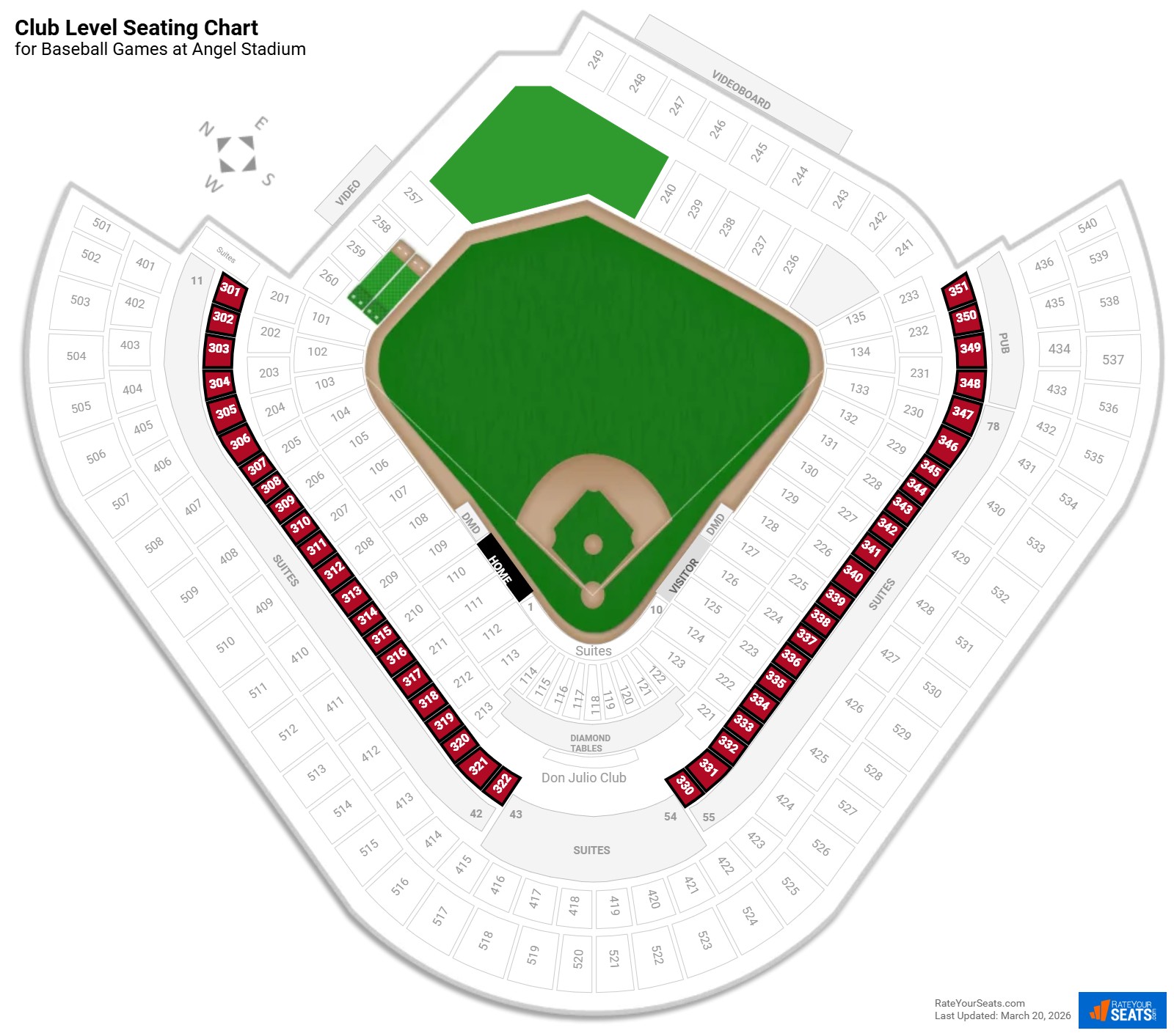Club Level sections wrap around the stadium, running from Section 301 down the third base side across home plate and around to Section 351 on the first base side.