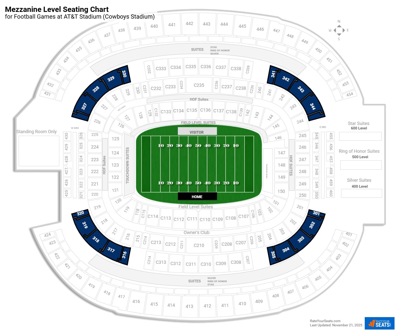 The 300 Level at AT&T Stadium is also known as the Mezzanine Level. This includes corner sections but does not include the side sections are commonly referred to as Silver Level Seats.