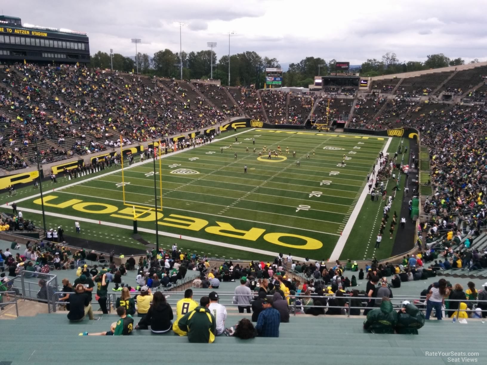 -Endzone seating at Autzen typically comes with a lower price tag than the rest of the stadium. While the lowest rows in these sections are incredibly close to the field, you'll find a better experience about 30 rows up. There you'll be close to the main walkway and will have an elevated view that makes it easier to see the other end of the field. The main videoboard is located above the west stands, so fans should choose seats in Sections 19-23 to avoid having to turn around to see replays.