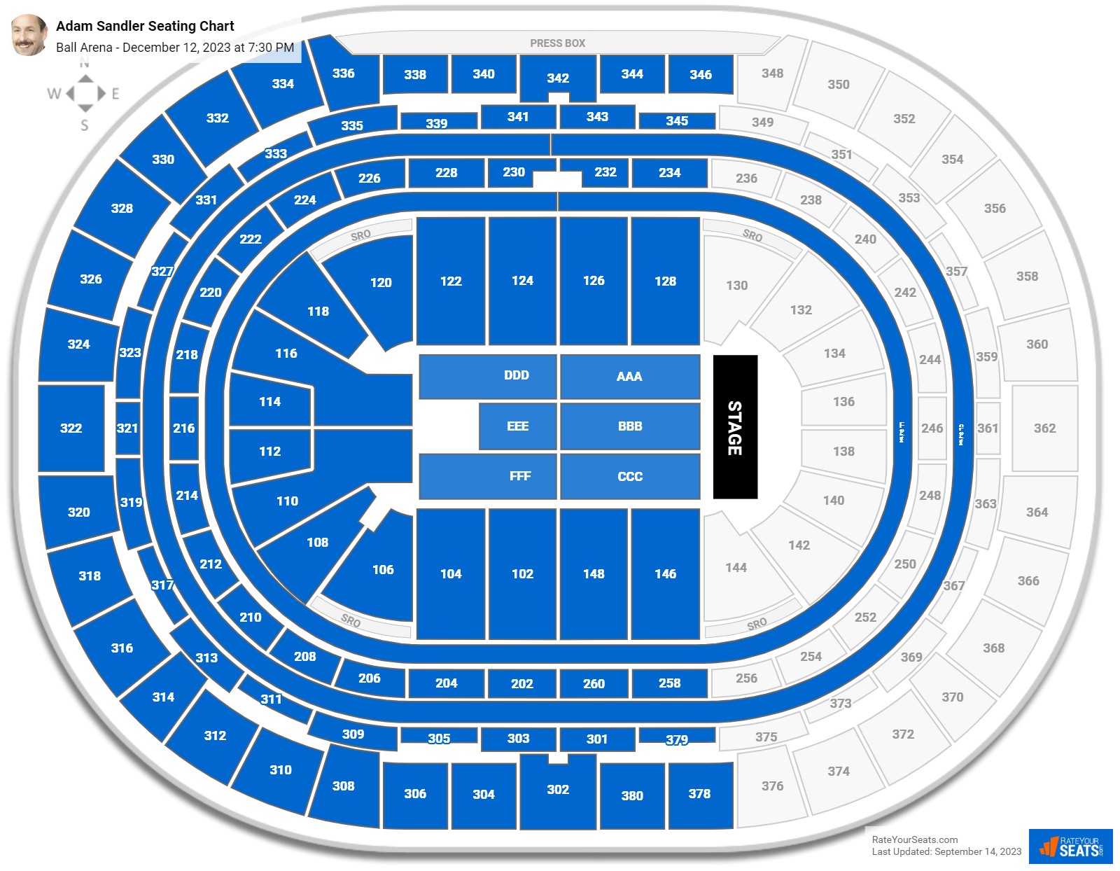 Ball Arena concert seating charts vary by performance. This chart represents the most common setup for end-stage concerts at Ball Arena, but some sections may be removed or altered for individual shows. Check out the seating chart for your show for the most accurate layout.