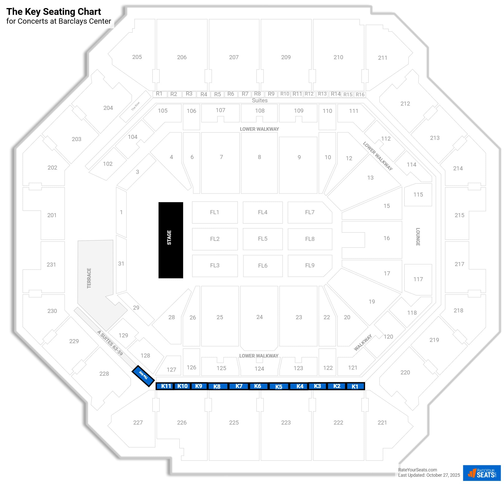 Located on Suite Level B, The Key spans the south side of the arena and consists of 11 sections, labeled K1-K11. Sections K5, K6, and K7 are closest to the center of the arena, providing prime views of the action.