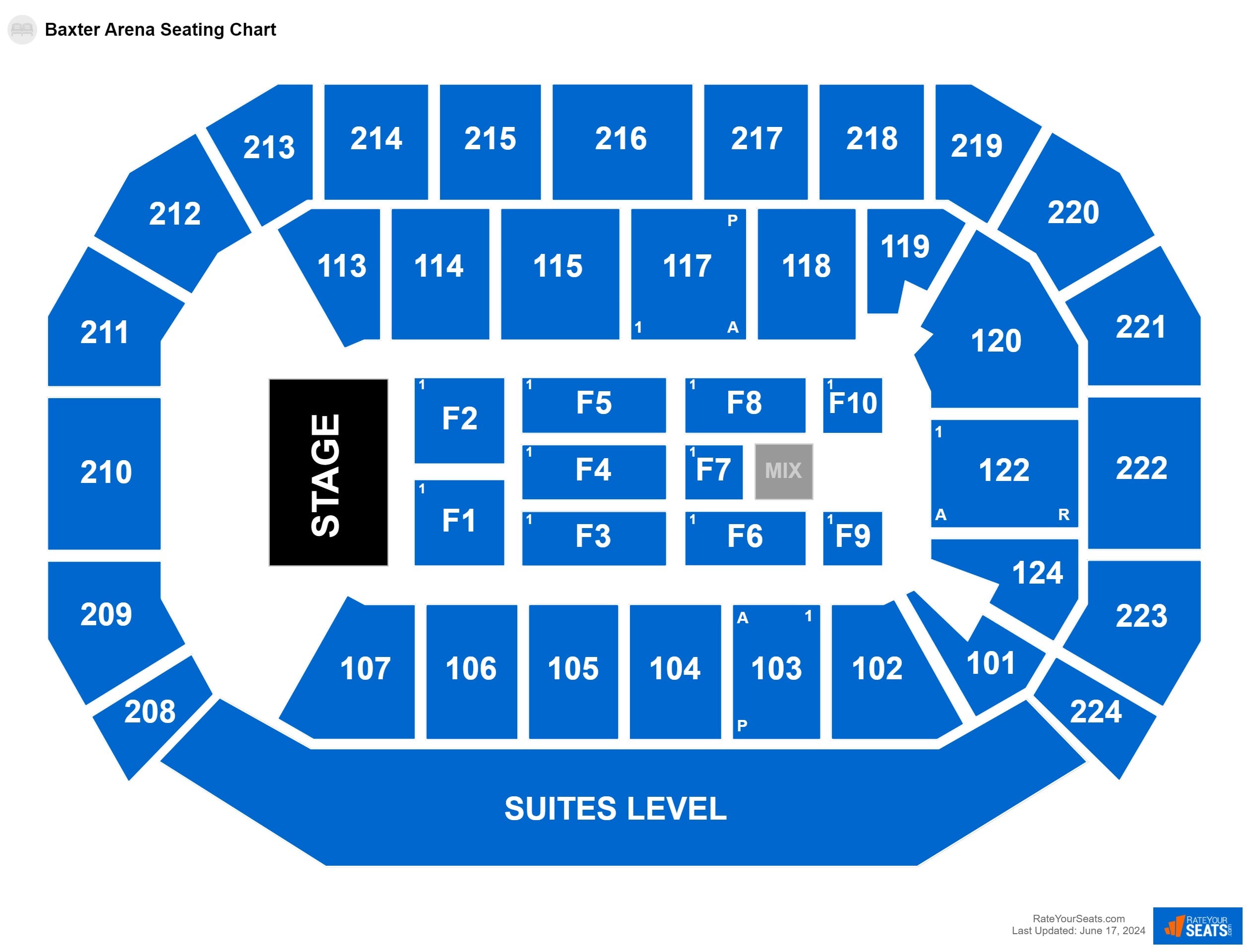 This seating chart represents the seating layout for most events at Baxter Arena. Click the map and then select your event to use an interactive map for your exact event.