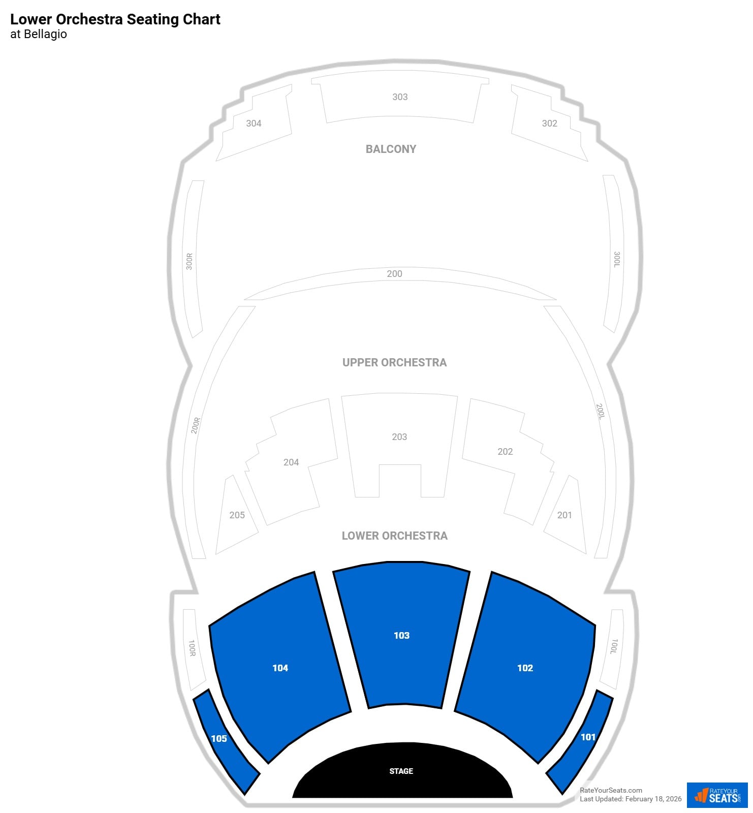 The Lower Orchestra is the primary seating level at the base of the O Theater, encompassing Sections 101, 102, 103, 104, and 105. These sections wrap around the front of the stage, with Section 103 sitting directly at the center. The first few rows (A–C) are positioned so close to the water that they are officially designated as the Splash Zone.