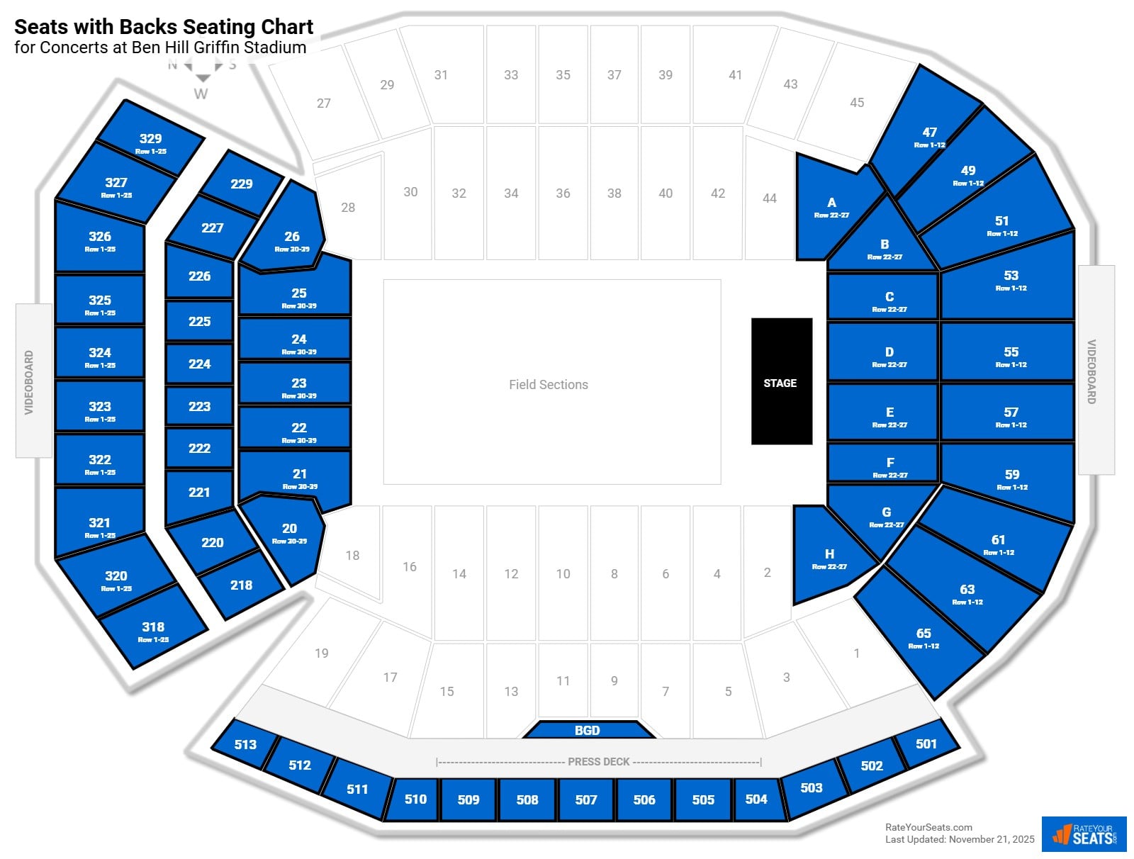 The following seats at Ben Hill Griffin Stadium are chairbacks: