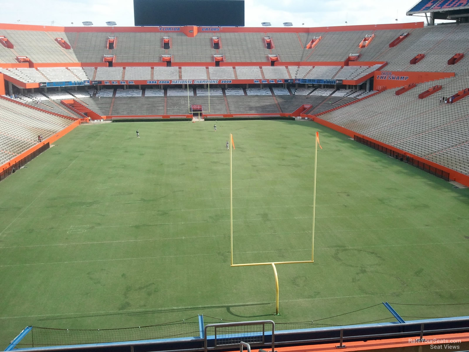 -Touchdown Terrace Seats are located just below the Sunshine Seats on the North side of the home of the Gators. Like the seats above them, some rows in these sections are particularly susceptible to the bright sun. Sections 226-229 are directly in the line of the setting sun and the first five rows receive no relief from the overhang. Fortunately, if you're seated in one of the more exposed seats, you can escape to the air-conditioned indoor club located at the top row of these sections. Terrace ticketholders have exclusive access to the club, its private restrooms and will also be treated to a pre-game buffet. While views of the field aren't great from the endzone, the height of these seats is very good and you can get some unexpectedly great angles towards midfield from corner Sections 218 and 220. All seats in this premium seating area are newer and feature a chair with a back.
