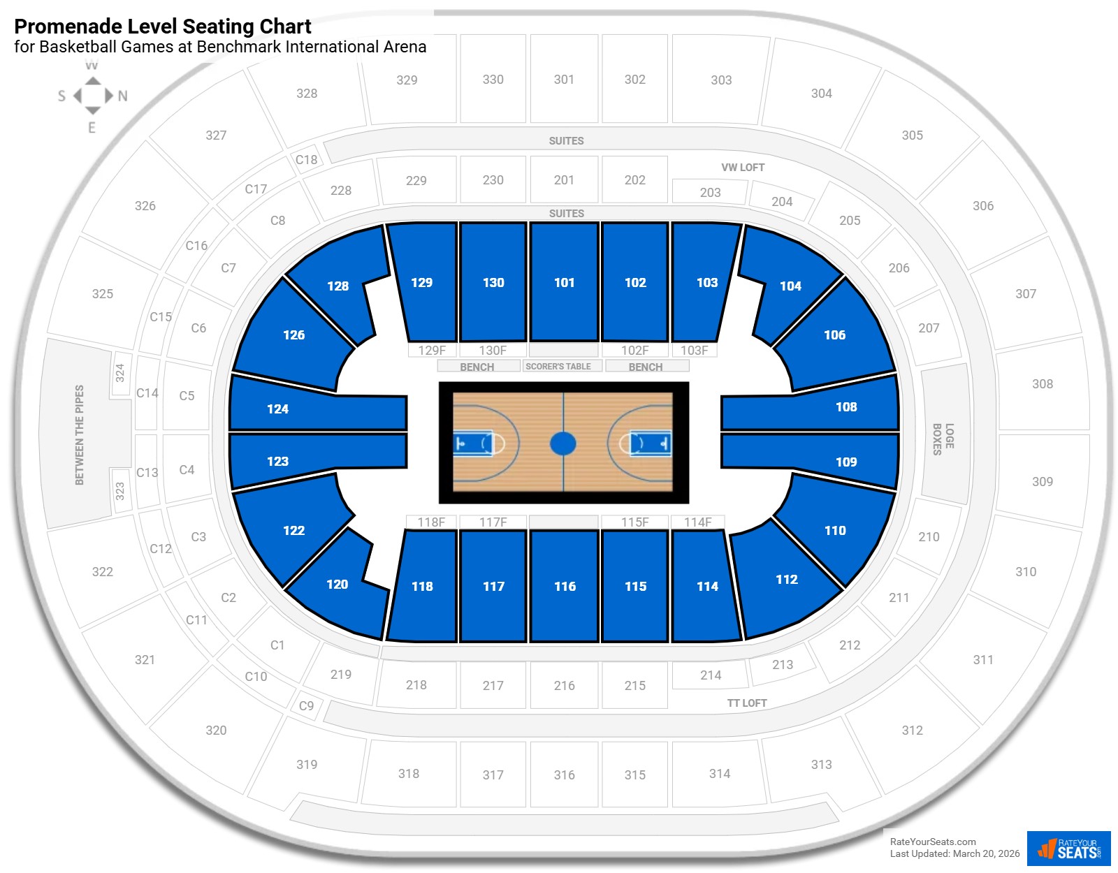 The Promenade Level at Benchmark International Arena is made up of sections 101-130 on the lower level. Given their close proximity to the action, these are widely regarded as some of the best seats in the building. But there are some differences depending on the event you're attending.