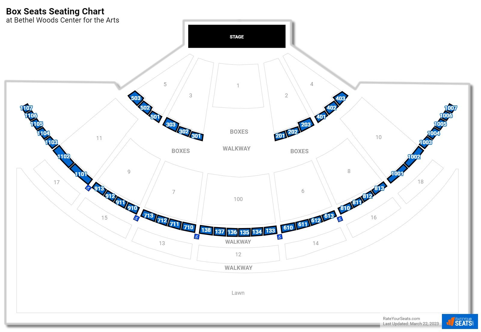 Box Seats at Bethel Woods Center are located at the back of each section in the Pavilion. To find where your Box is located, look at the first two digits of the Box on your ticket. For example, Box 403 is directly behind Section 4, while Box 1002 is behind Section 10 (Boxes 133-138 are an exception; they're behind Section 100).