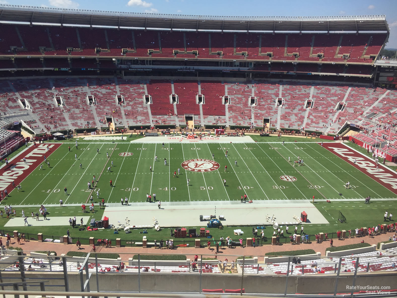-Side seating on the upper level is comprised of both U3 sections behind the Alabama sideline and U4 sections behind the visitor sideline. Both of these types of sections are the top of their side of the field and have similar sightlines. Although the views are similar, U3 tickets command a much higher premium than U4 seats. The U3 side features chairback seating in every row, while the U4 side seats are all bench style. Additionally, the U3 sections are the first in the stadium to get shade when the sun begins setting. Almost every section in this seating zone is made up of 30 numbered rows. If you want to be covered by the roof and don't mind walking a bunch of stairs, choose Rows 20 and above on either side of the field. But if you'd prefer quicker trips for concessions and restrooms, stick with rows 10 and below. Not only will these sections give you a view similar to premium seating, you'll be just a few steps away from the concourse tunnel.