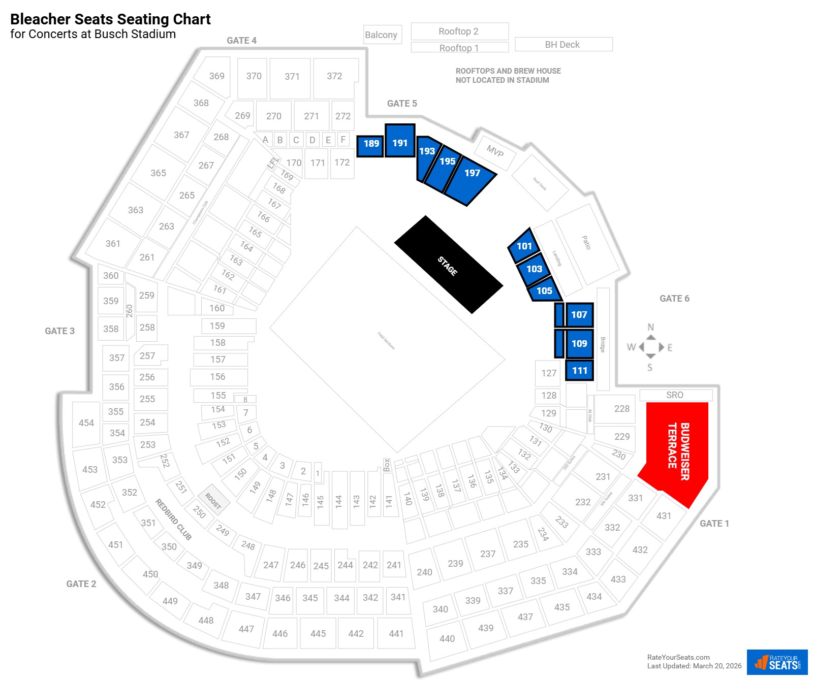 Outfield Bleachers at Busch Stadium run from right field to left-center field, covering sections: