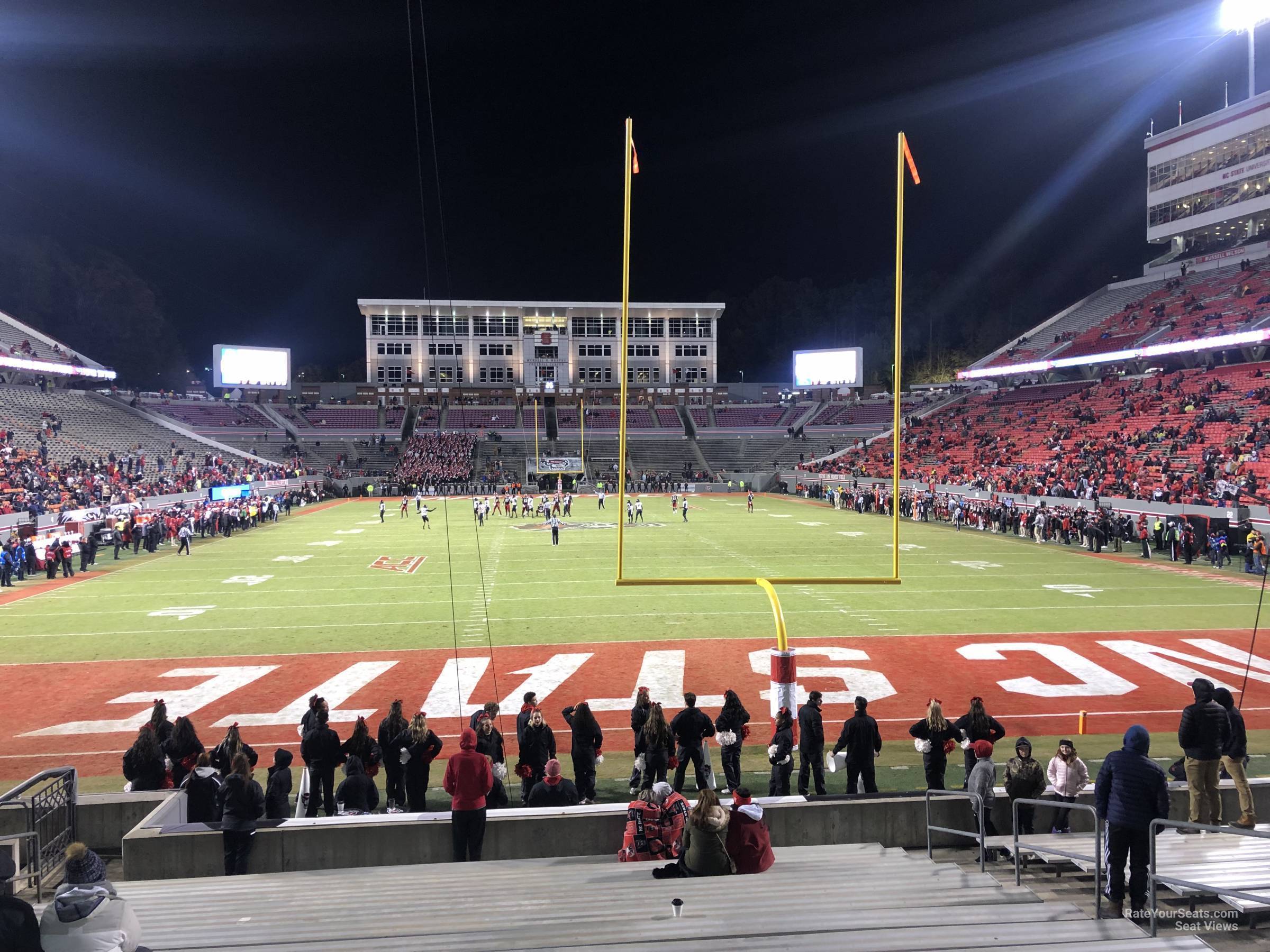-All seating in the 100 Level Endzone sections are designated as student areas at Carter Finley Stadium. Fans in these areas should be prepared to be immersed in standing, rowdy fans, which can make for an exciting atmosphere if you don't mind standing up to see the action on the field. Sections in the west endzone are larger than those in the east, featuring 26 lettered rows of seating (single letters located at the front), but have very good head on views of the main videoboard above the east endzone. Fans in the east endzone will have an easier time getting to and from the seats with just 14 lettered rows, but will not have a view of the main videoboard located above and behind the seats.