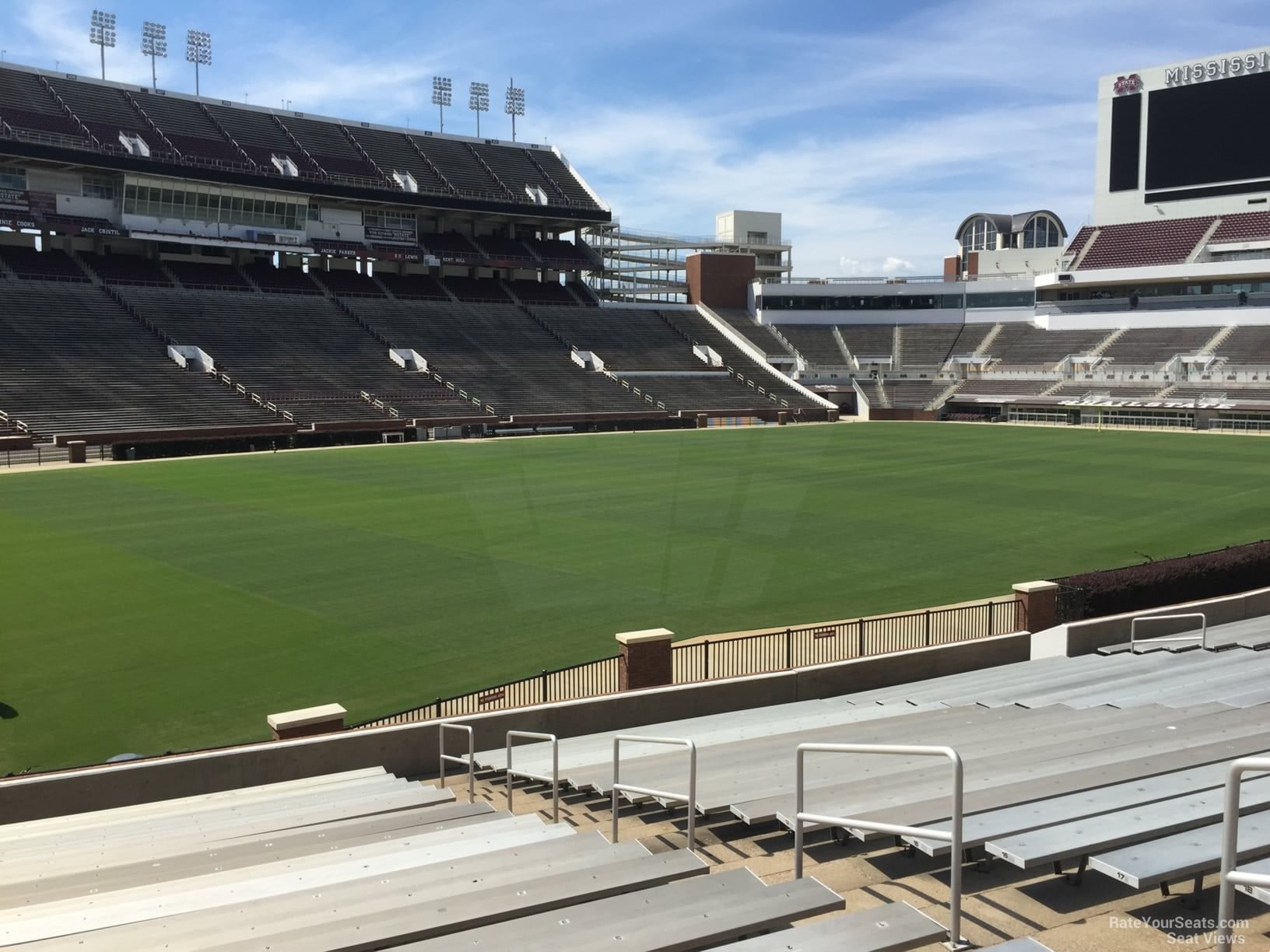 -The expansion of Davis Wade Stadium preserved most lower level bowl sections. Each section contains up to 59 rows of seating and some of the best views in the entire stadium. Sideline Seats Fans seated close to Row 30 will only have to navigate a few steps to their seats, and will be at an ideal height for seeing the whole field. The State sideline is on the West side of the field (Sections 01-07), leaving the visitor side of the field as the sunny side. Rows 45 and higher in Sections 03-05 will be the first to be shaded during the afternoon. Sections 101-113 are an extension of the West stands and include nine rows of seats beginning at Row 60. These seats are fully covered - but beware of the high rows - views of the scoreboard are blocked by the overhang. North Endzone North endzone seats are reserved for State students. These sections feature up to 40 rows of seats with good views of the North scoreboard. High rows in Sections 10-13 provide the best views of the field and are often shaded by the scoreboard behind them.