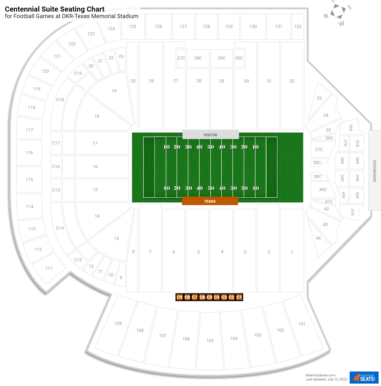 The Centennial Suite Club Seats are some of the best seats for Texas football. On the DKR Stadium seating chart, these are located on the Texas side of the field in sections CR1-CR9.