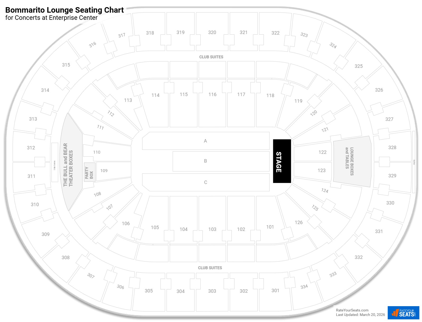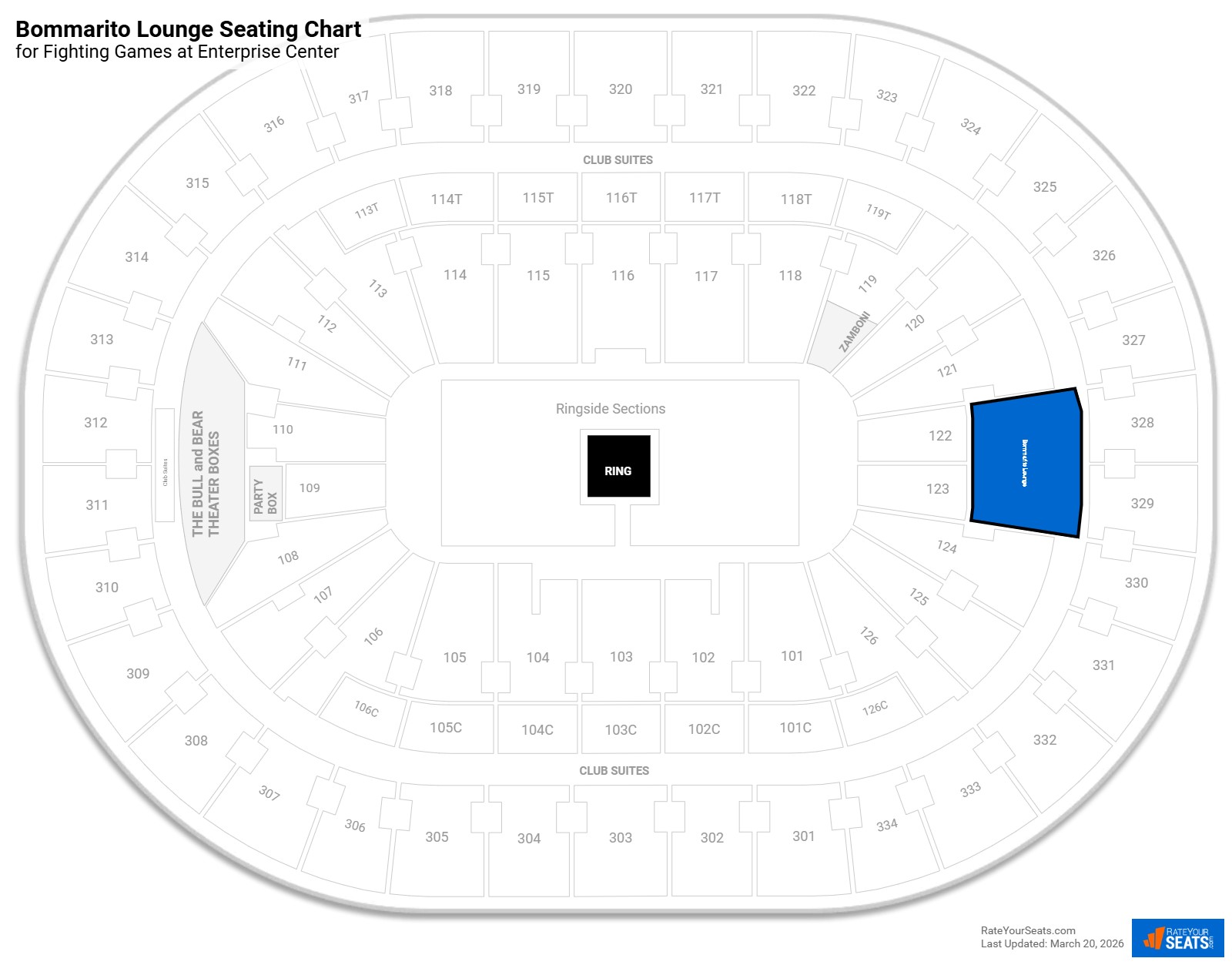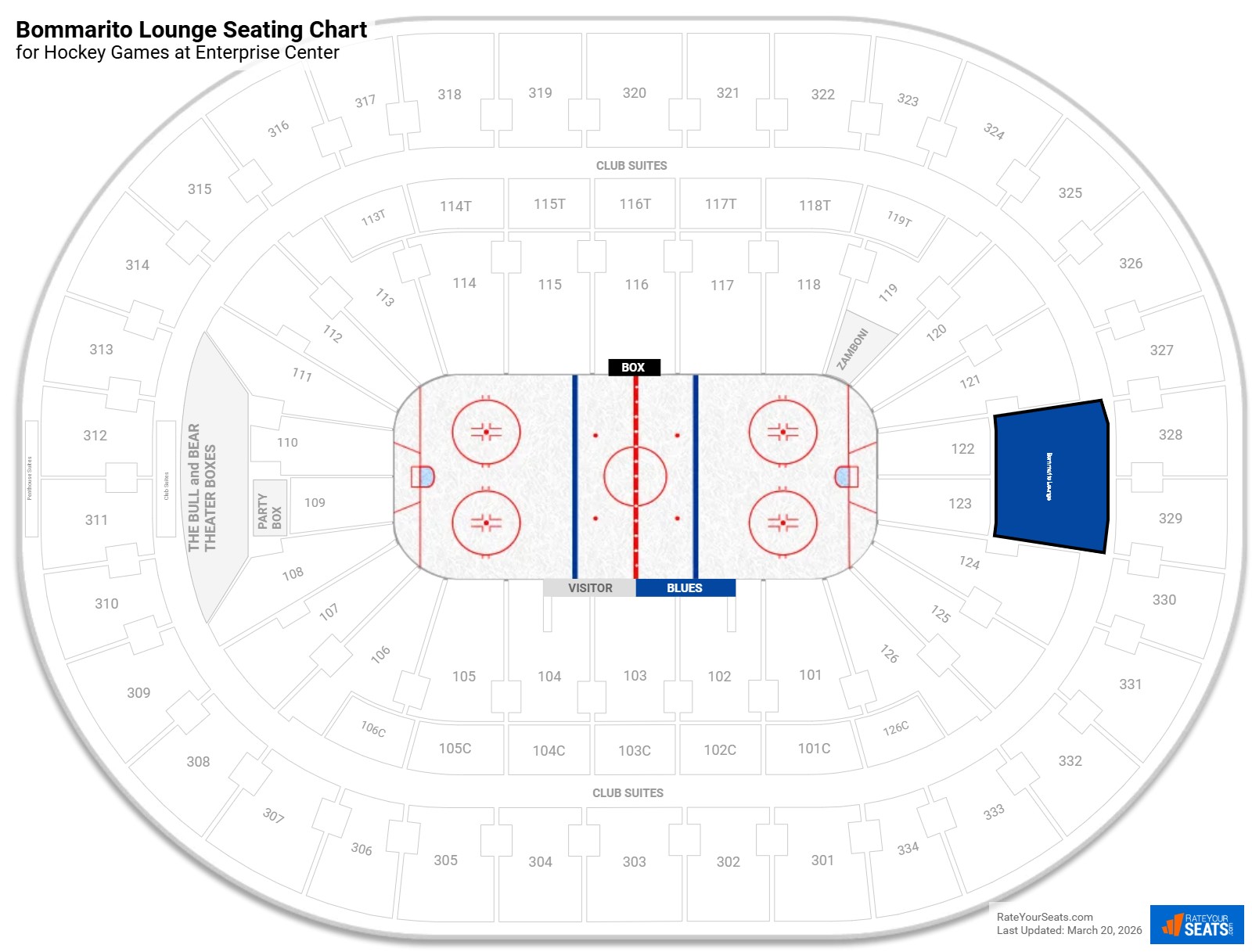 While the Enterprise Center has no shortage of premium seating in the lower bowl, one of the newest additions - the Bommarito Lounge - should not be over-looked. The upper rows of sections 122 and 123 were removed to make way for tables and lounge boxes that over-look the ice.