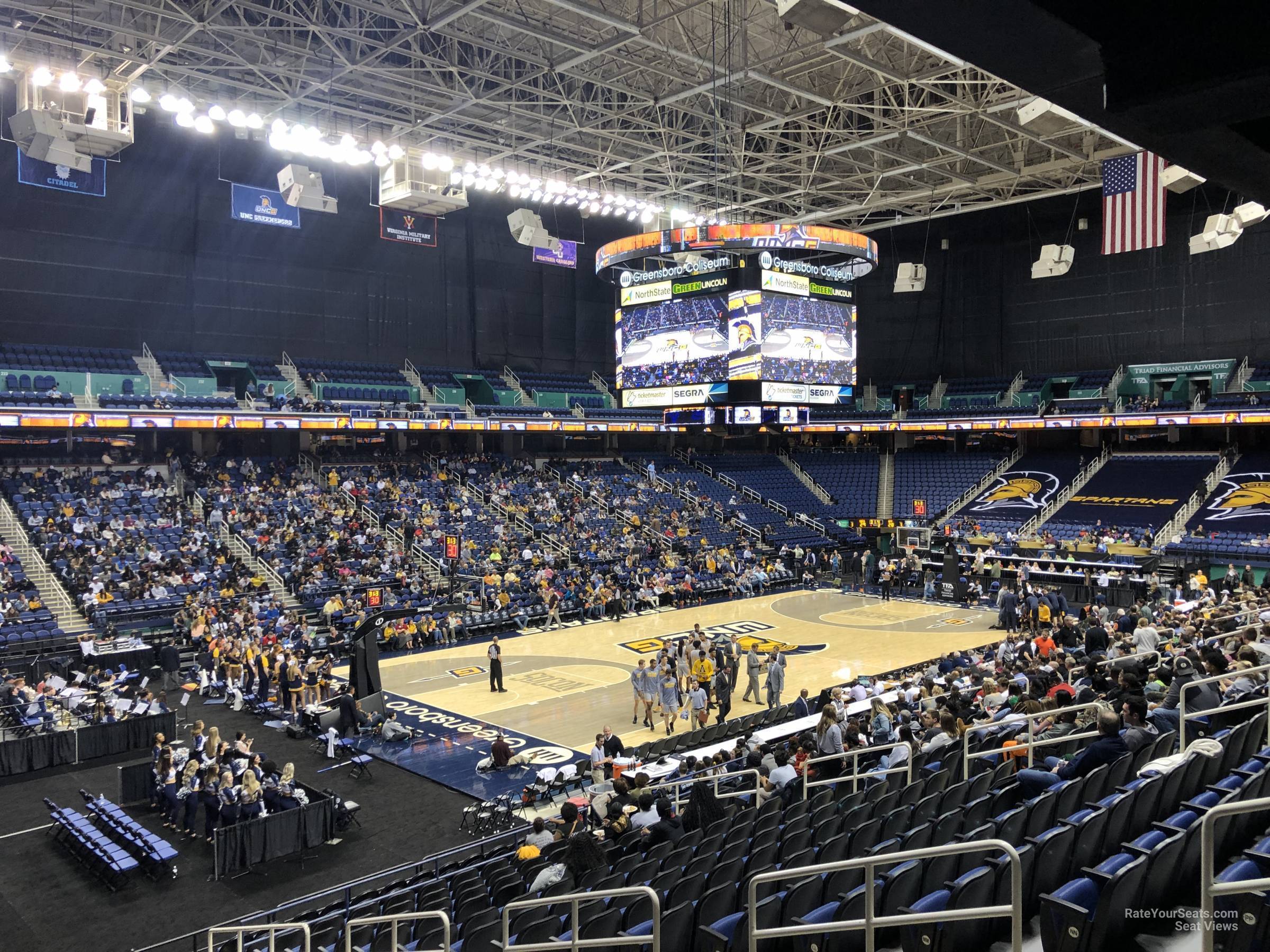 -Located between the baseline and sideline sections, the lower level corner sections provide a decent view of a basketball game at Greensboro Coliseum. Seats long the sideline are definitely preferable, but lower level corner seats provide a good view of the action. Note that the floor area at the historic First Horizon Coliseum is large enough to host a variety of events. Therefore, the seats in the lower level corner are not located directly on the court. Rather, they're significantly far away in the corner. Regardless, sitting in the corner sections isn't a bad option. With suites located in each section and close proximity to refreshments and restrooms in the lower level concourse, sitting in the lower level corner is a good choice for a basketball game.