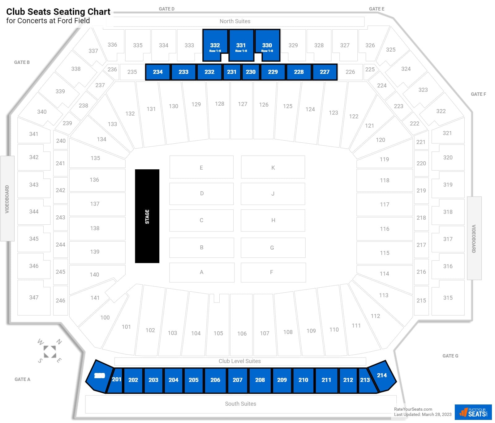 The 200 Level at Ford Field is sometimes referred to as the Club Level. But only about half of the 200s sections are true club seats. These include 200-214 on the South side and 227-234 on the North side.