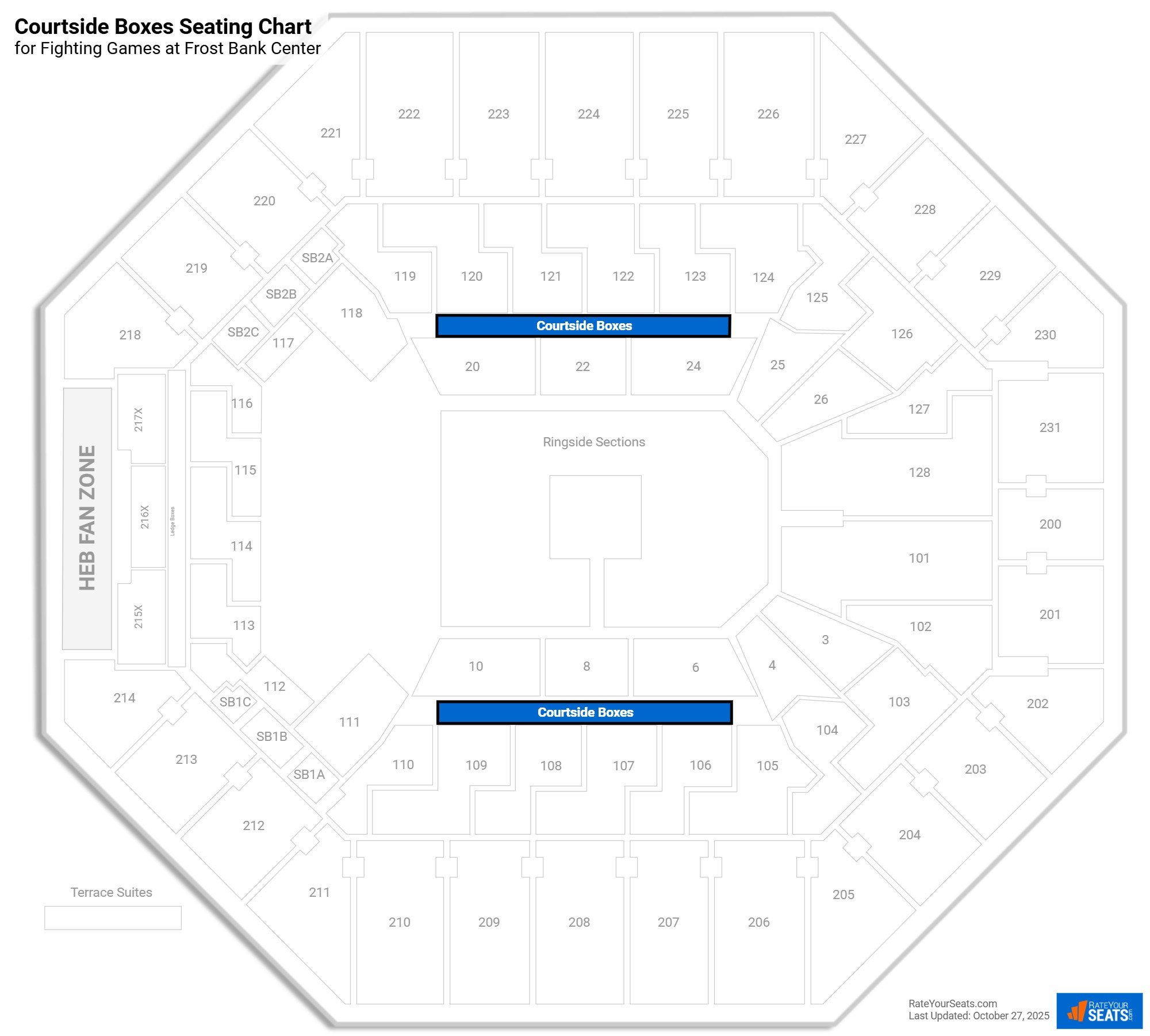 Courtside Boxes are some of best seats at Frost Bank Center. These semi-private sections are located along both sidelines between the Charter Level and Plaza Level seats. Each box contains space for up to 12 guests who will enjoy extra-large seats and great legroom.