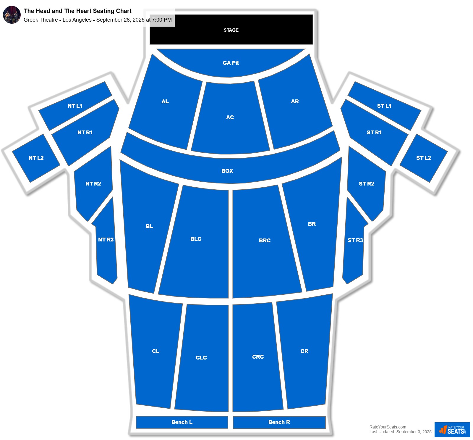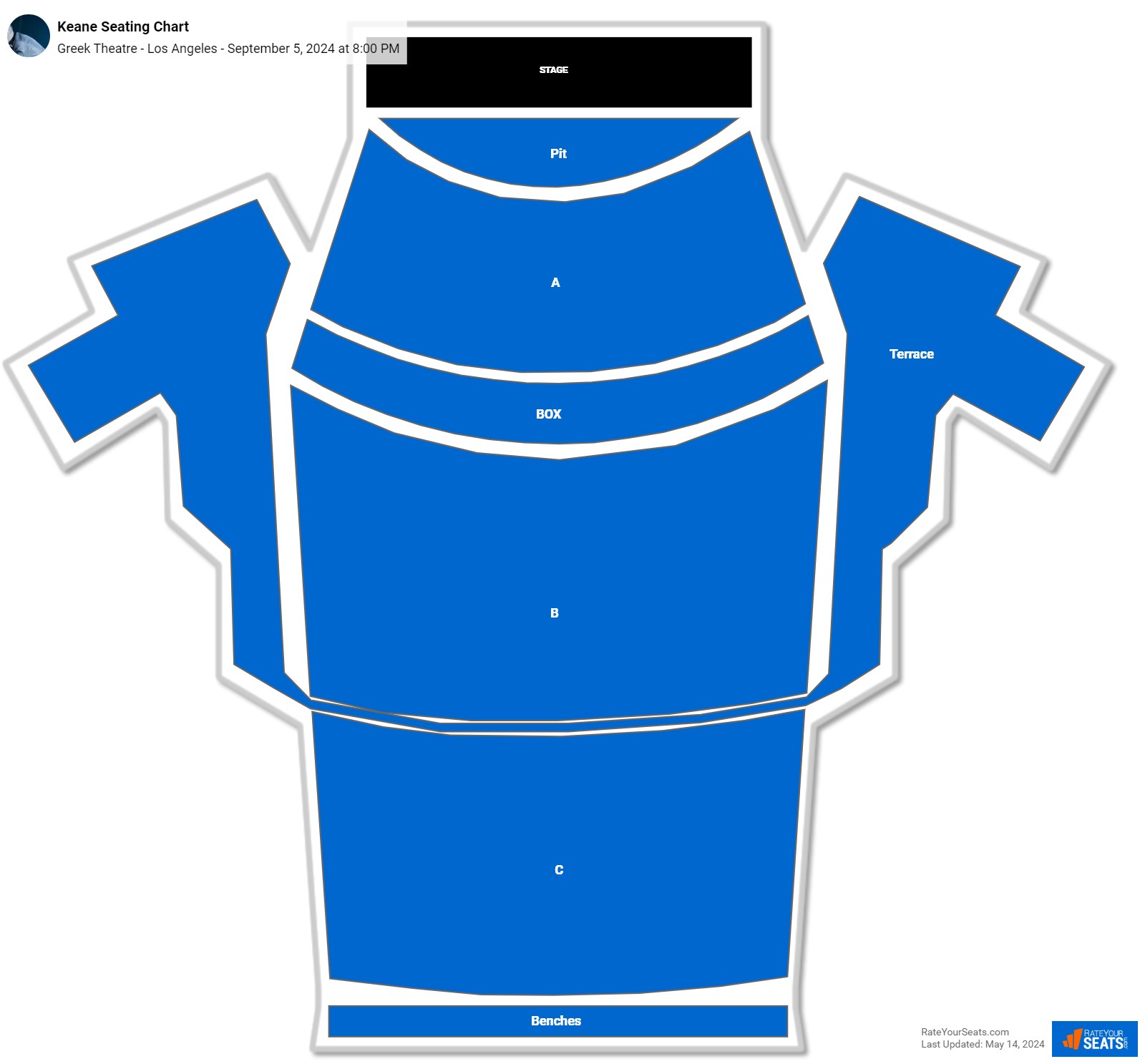 Greek Theatre - Los Angeles concert seating charts vary by performance. This chart represents the most common setup for concerts at Greek Theatre - Los Angeles, but some sections may be removed or altered for individual shows. Check out the seating chart for your show for the most accurate layout.