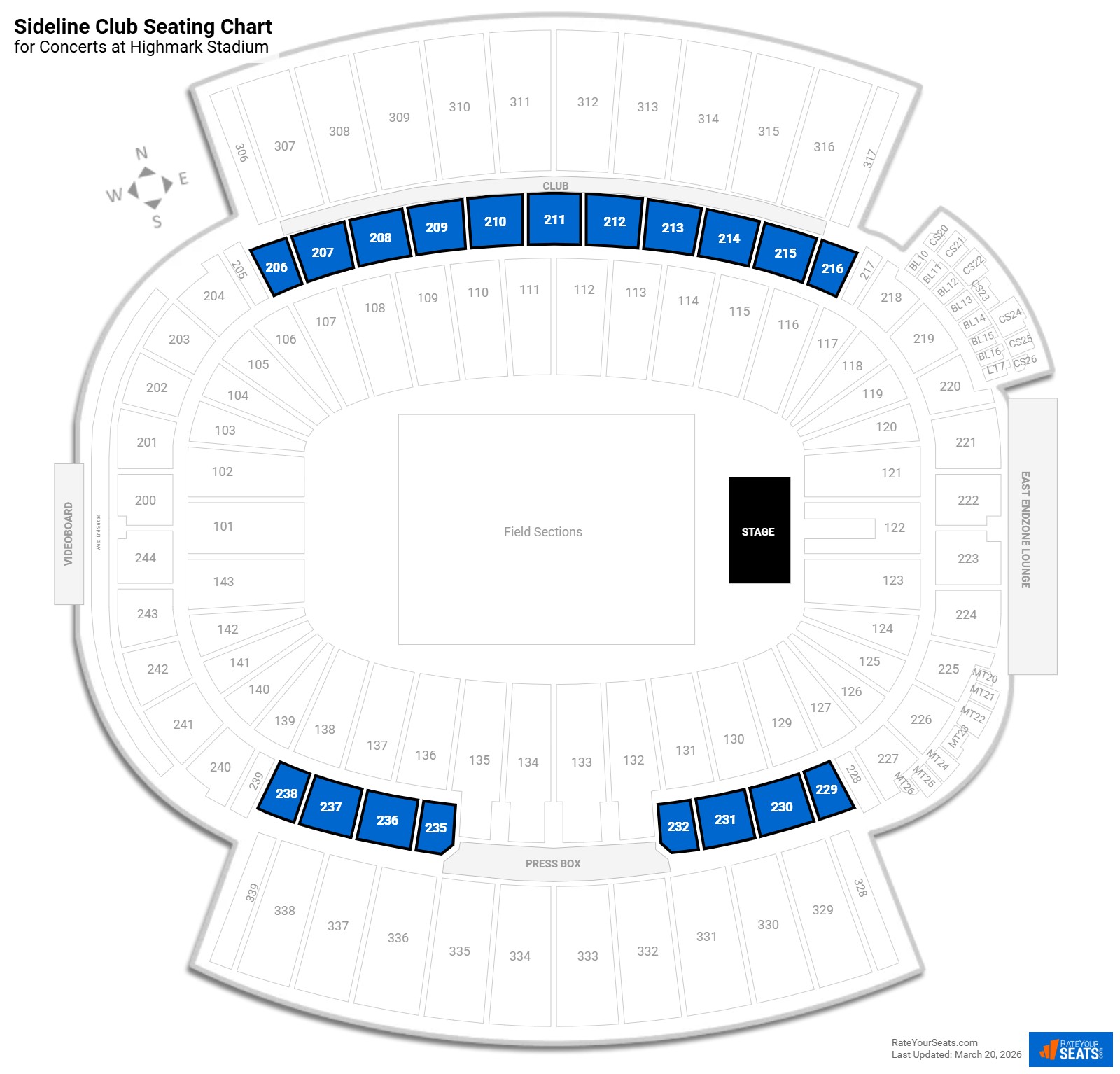 Sideline Club Seats at Highmark Stadium are located on both sides of the field on the 200 level. Sections 206-216 are on the north side of the stadium, while 229-238 are on the south side.