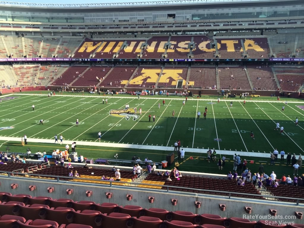 -Upper Level Sideline seating includes sections 237-244 on the home sideline (this is the home side for most Gophers games) and 207-214 on the visitor sideline. These seats are among the cheapest chairback seats available for football games at Huntington Bank Stadium. Sections 239-242 only have 13 rows of seating, making for much easier access to and from the concourse. All other sections in the location have as many as 35 rows of seating.