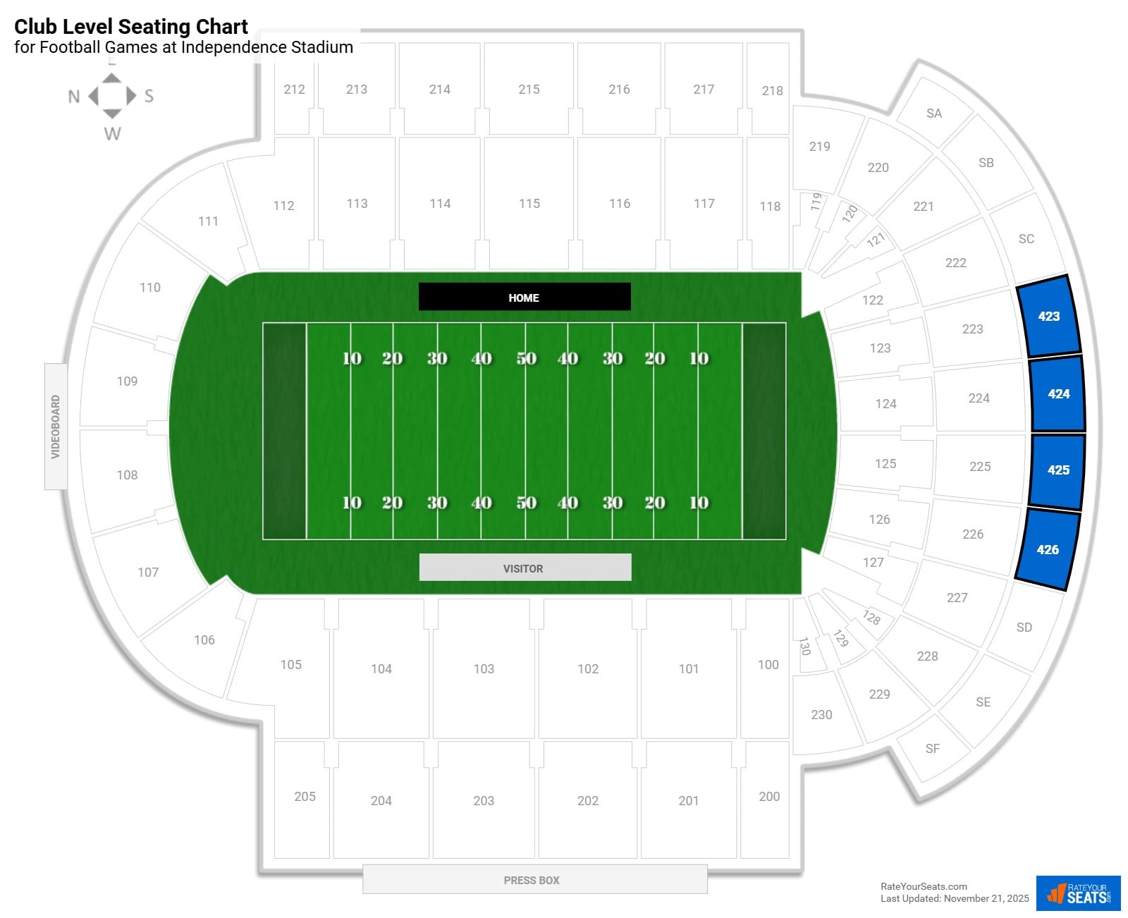 On the Independence Stadium seating chart, Club Level sections are located in the South endzone near the Suites.