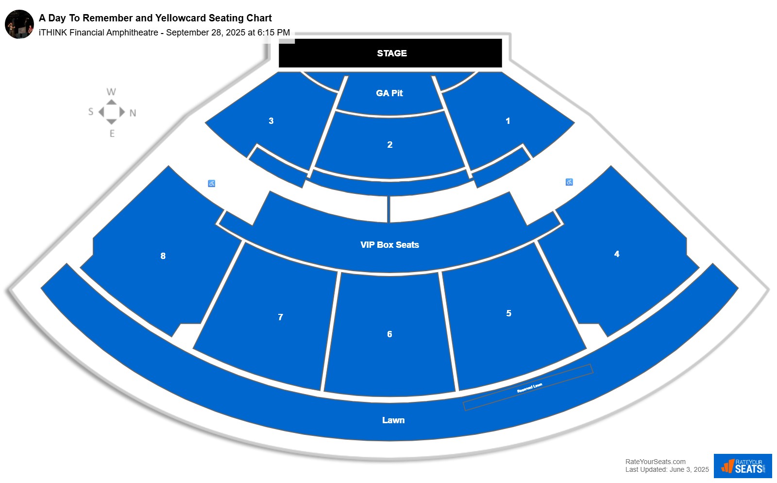 iTHINK Financial Amphitheatre concert seating charts vary by performance. This chart represents the most common setup for concerts at iTHINK Financial Amphitheatre, but some sections may be removed or altered for individual shows. Check out the seating chart for your show for the most accurate layout.