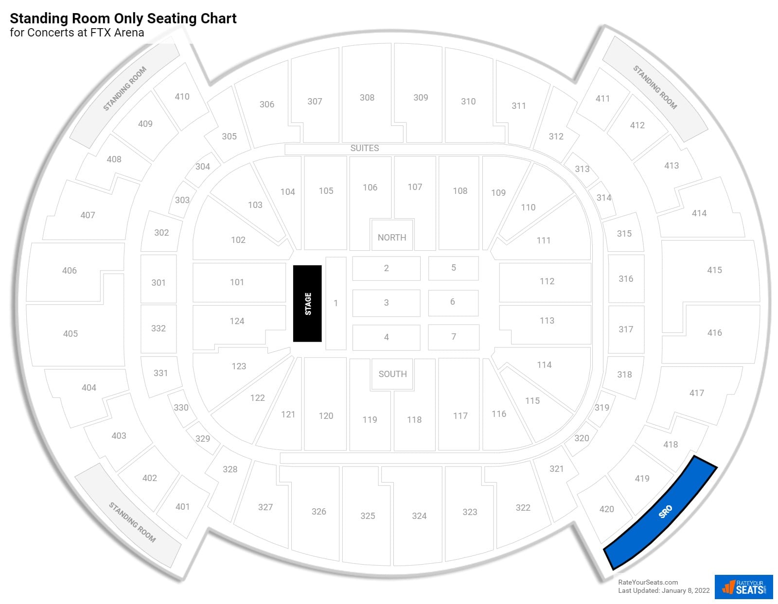 - SRO tickets on the West side can access via Sections 401-404 or 407-410
