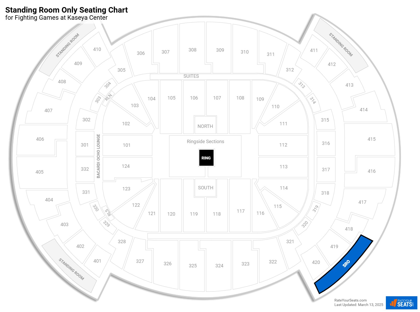 - SRO tickets on the East side can access via Sections 411-414 or 417-420