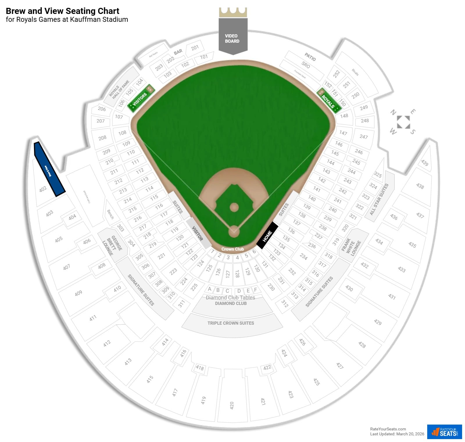 The Brew & View area is located on the View Level in front of Section 402 at Kauffman Stadium.