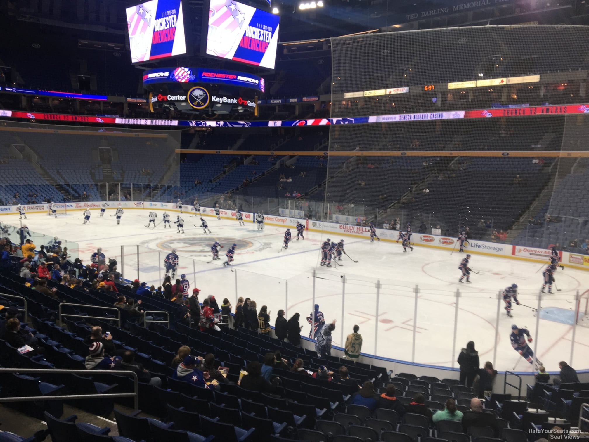 -Corner seating on the lower tier will keep you close to the action will providing a unique viewing angle which you don't often find when watching on TV. The positioning allows you enjoy both the goal to goal and cross ice movement, and from this close to the ice it is a great place to truly appreciate the speed of the game. Sabres fans will want to be in Sections 107-109 or 113-115 as you'll get two periods of the home team shooting at the near net. Section 113 is also unique as it is located just above the Zamboni entrance, making it a good option if you're bringing children to the game.