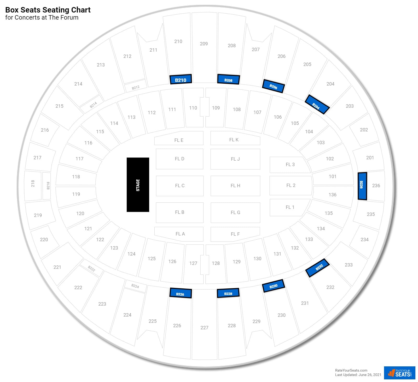 Box Seats at Kia Forum are separate areas located at the bottom of select 200 level sections. These boxes are lounge-like areas with a table and comfortable couch seating. These are not separate rooms, but do offer a more premium experience compared to normal stadium seating.