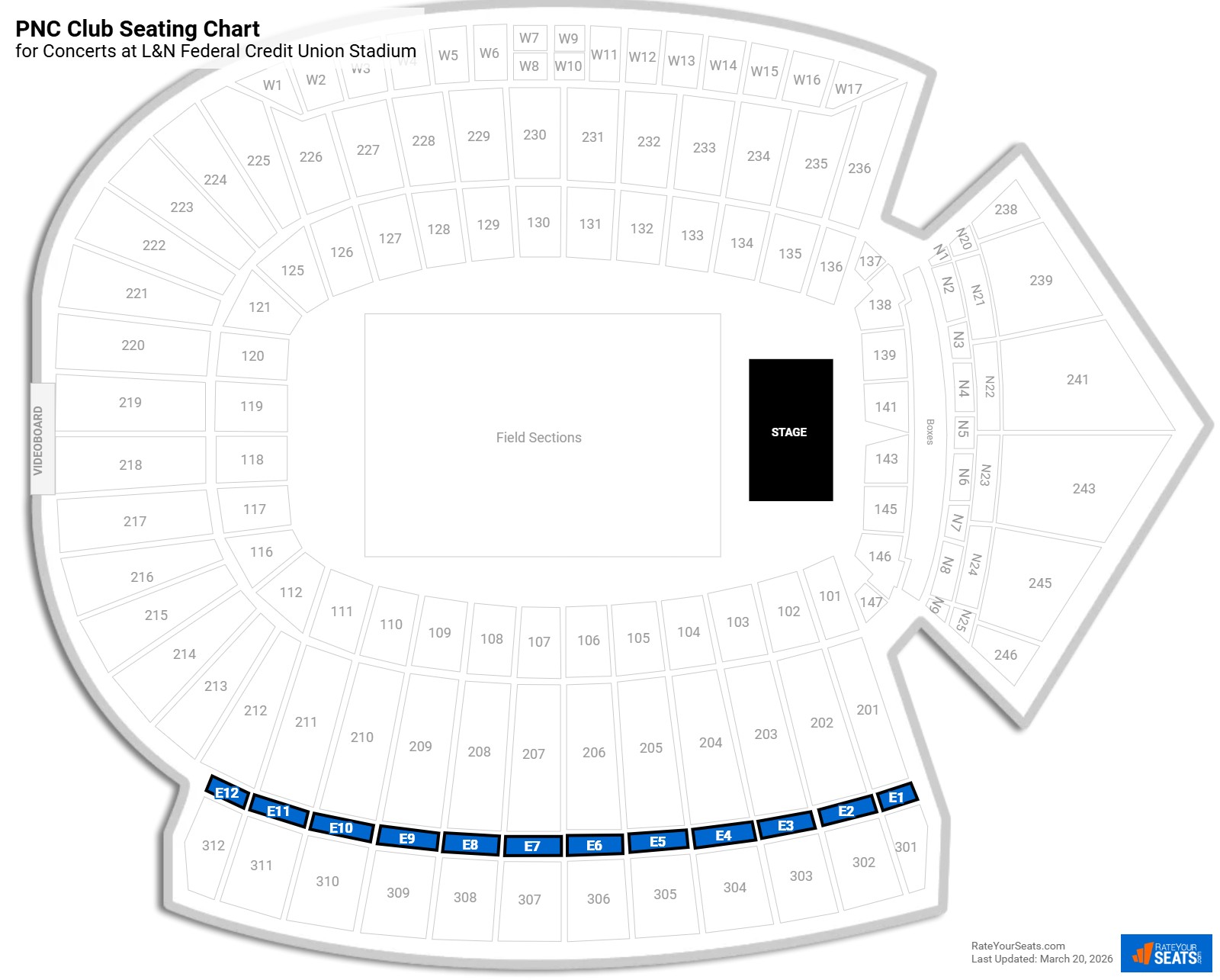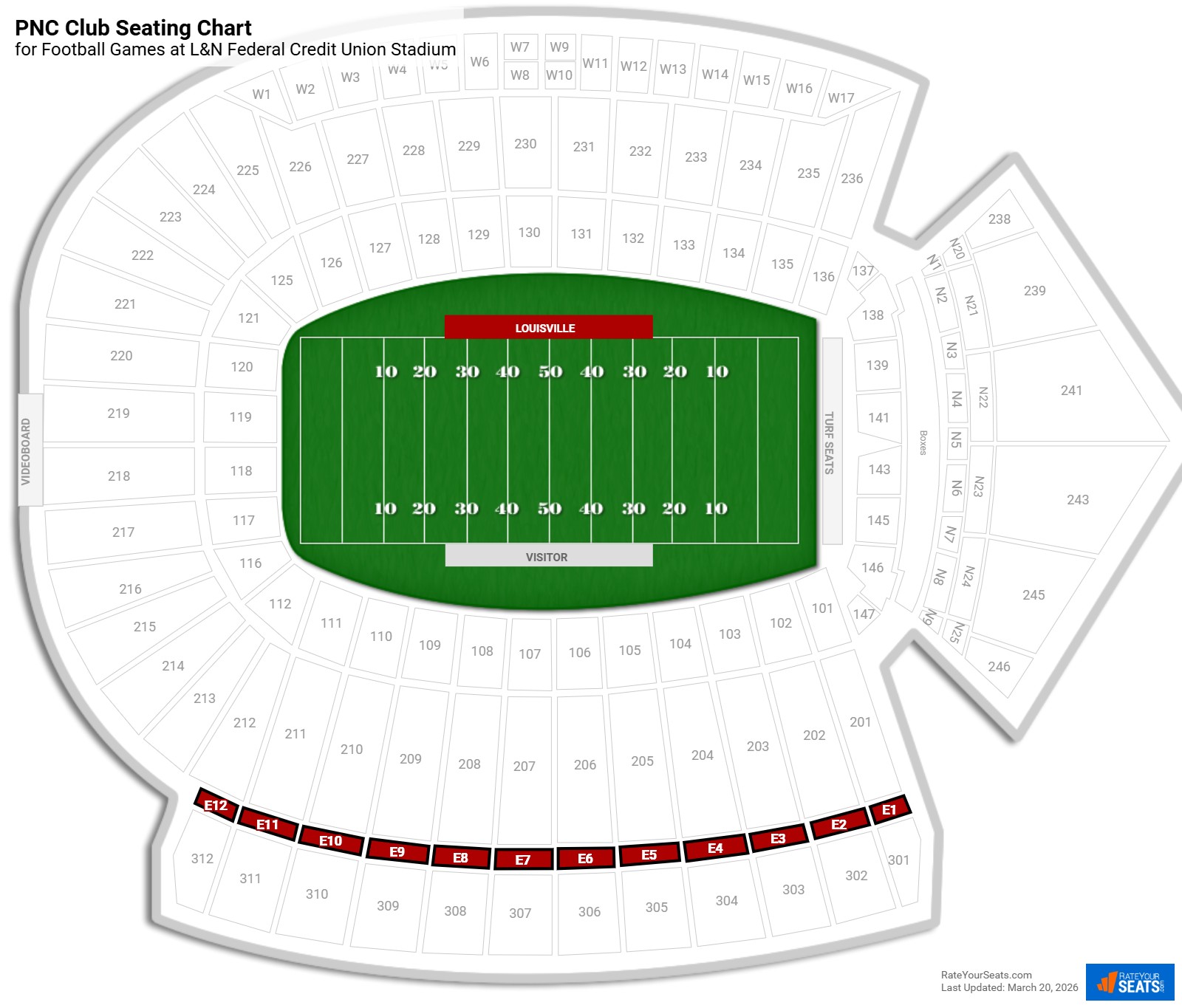 Loge sections E1-E12 (previously L1-L12) are a part of club seating and come with access to the PNC Club. Each loge section features comfortable outdoor seating with an elevated sideline view. Even without premier amenities, many Louisville fans would agree that the views alone from Loge Sections 5-8 make them the best in the stadium.