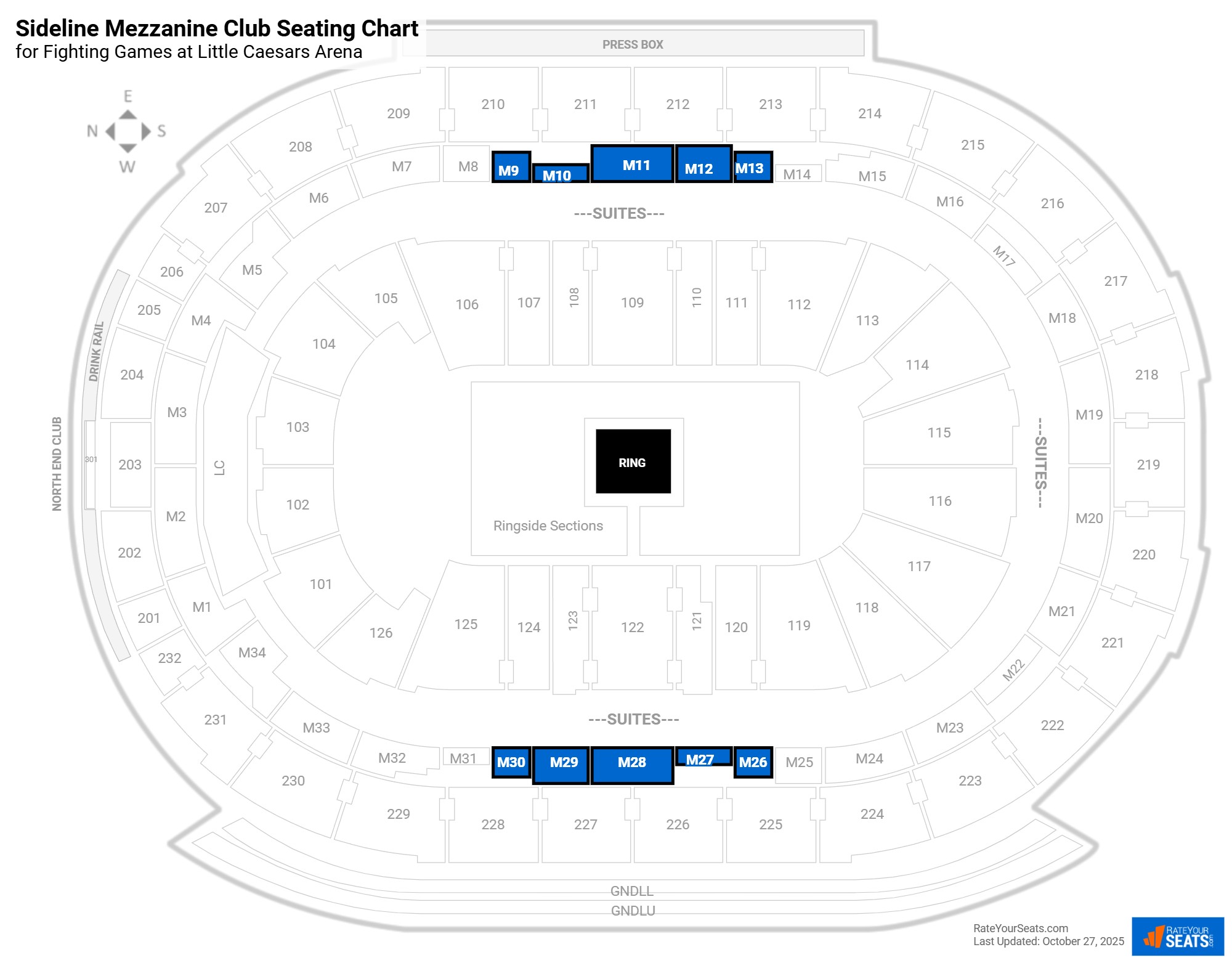 Sideline Mezzanine Club Seats at Little Caesars Arena are located in sections Mezzanine 9-13 and 26-30. These are some of the smaller sections in the arena with five or fewer rows in each section.