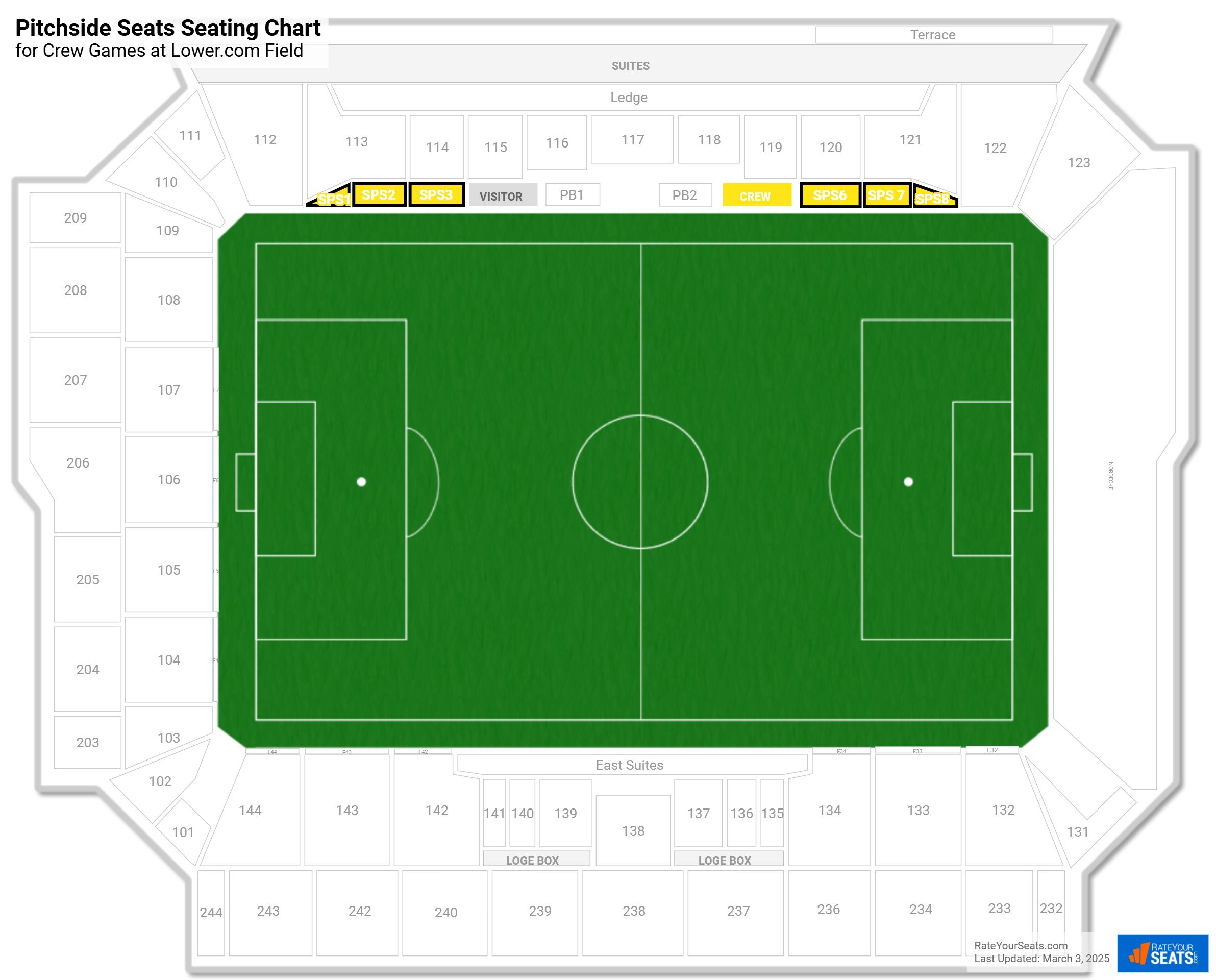 The Pitchside Seats at Lower.com Field are as close as you can get to the match without being a Crew player. Also referred to as the West Field Suites, these seats sit at field level and give up close and personal views of the players and the speed of the game. They are some of the smallest sections in the stadium holding only two rows each.
