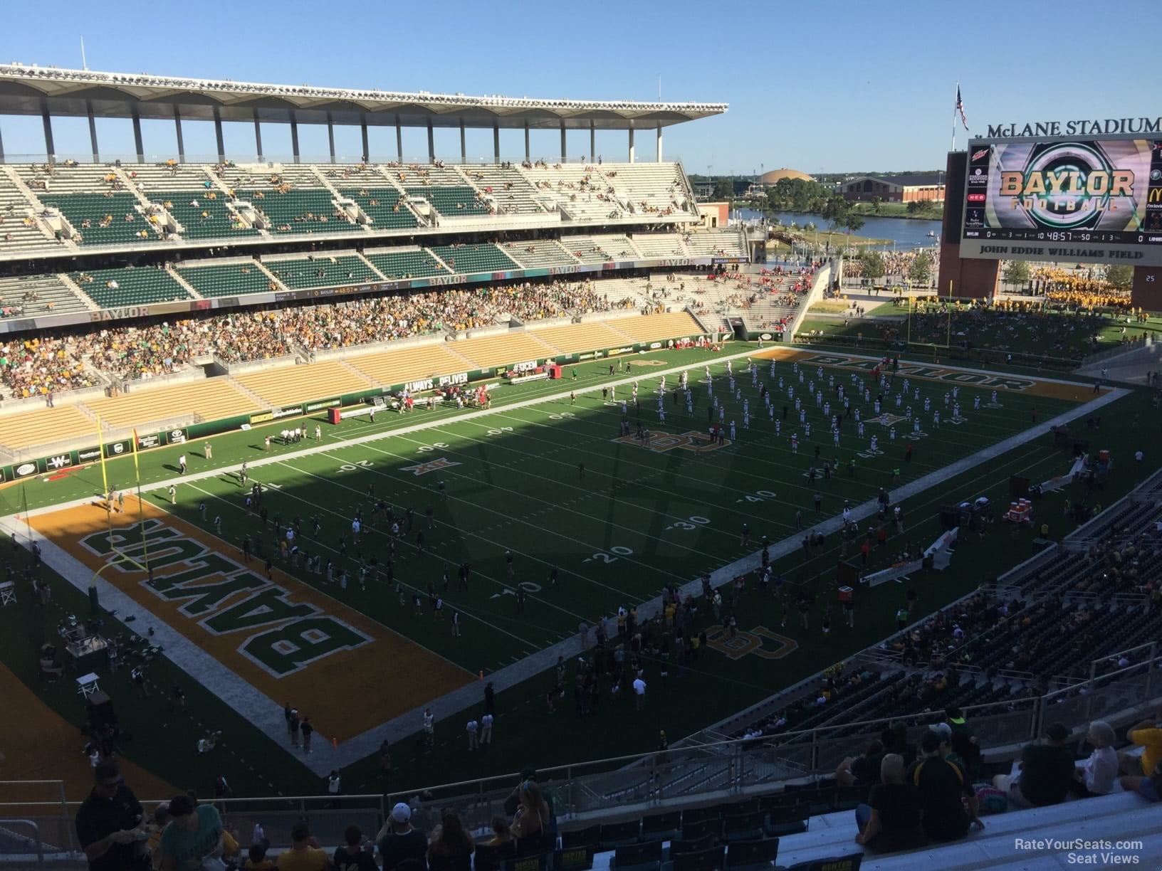 -Corner seating on the 300 level will have some of the least desirable views on gameday, but as a result these sections are also a great place to find cheap Baylor football tickets. Opt for sections in the northwest corner (Sections 310-312) where you'll find better relief from the sun and good views of the south endzone videoboard. Sections in the southeast corner (327-329) will see some of the most sun during day games at McLane stadium, combined with poor views to the large videoboard, we recommend fans look elswehere before purchasing tickets in these three sections. Sections 319, 328 and 329 are reserved for visiting team seating.