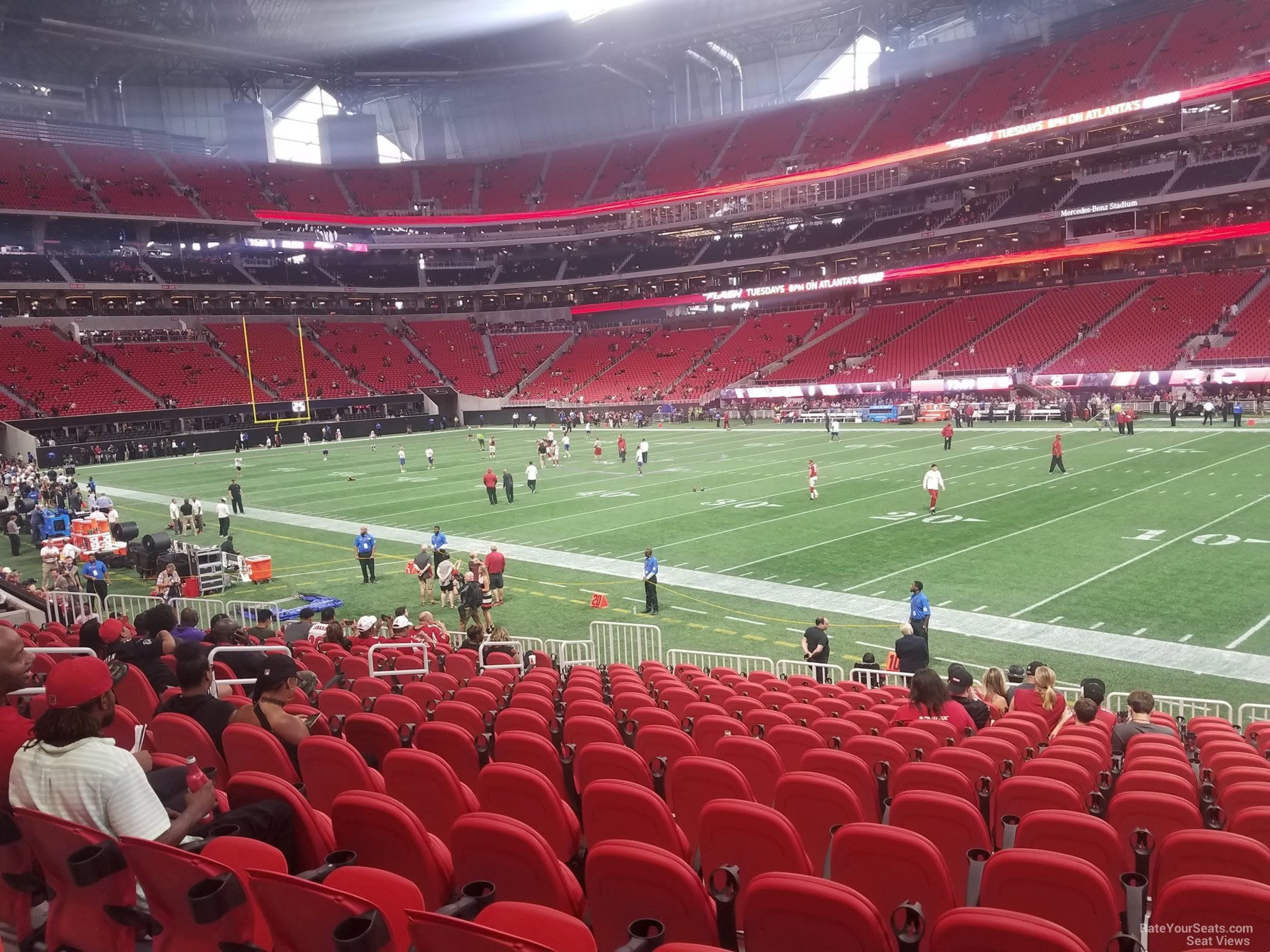 -One of the best values at Mercedes-Benz Stadium is corner seating on the 100 level. These seats offer good sitelines to the field and are priced at a fraction of the cost of adjacent sideline seating. Each section has more than 40 numbered rows of seats with lower-number rows closer to the field and higher-number rows closer to the concourse. Seats in the first 15 rows will give you one of the best views of the near endzone and you'll be one of the first fans to see if the ball crosses over the goal line. Unfortunately, sitting in one of these lower rows can make it difficult to see action that moves towards the opposite goal line. If you don't mind sitting up from the field, consider rows 30 and higher where you'll get a comfortable view of both ends and you'll have fewer stairs to walk to get concessions.