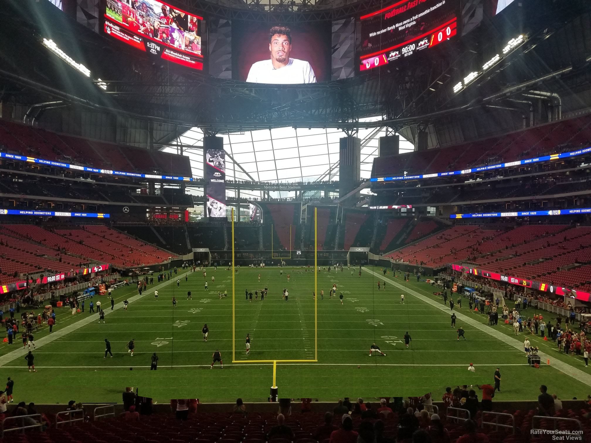 -When looking at endzone seats for a football game at M-B Stadium, there are two distinct options. The first is Sections 117-121 on the west side of stadium. These are more traditional endzone sections with roughly 40 rows of seats in each section. Behind the east endzone are sections 101-103 and 135-136. Sections 101-103 are the largest sections in the stadium with up to 60 rows of seats in each section. The upper rows of these sections are the cheapest lower seats for a Falcons game and are more steep than the rest of the stadium. This is expected to help keep the noise from traveling out and create a loud environment in these endzone seats. Another feature of the east endzone is access to the main plaza above sections 134-136. From there fans will find the window to the city and an excellent view towards downtown (sitting in the higher rows of sections 117 and 118 will also give a direct view through the window). This area is expected to be a popular place for fans to congregate on before the game and during halftime.