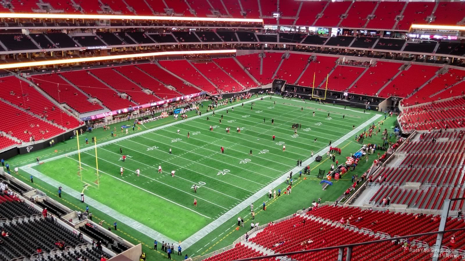 -The 300 Level at Mercedez-Benz Stadium is where you'll find the cheapest tickets for Falcons games and other events. Although these seats have a reputation of being far away from the action, there are some good seats in these sections. The Best Seats In Each Section Are Rows 4-10 The 300 Level is separated from the field by 50 rows of common seating and two levels of suites. As a result, the front rows are the equivalent of about 70 rows from the field. Understandably, the best views will in the lower rows. Another reason to sit in a lower row is to be closer to the 300 Level Concourse. The entrance tunnel for most 300 Level sections is at Row 4. Being close to this row will require fewer stairs to reach concessions and amenities. Finally, a disruptive railing obstructs views from the first few rows in many of these sections. We recommend saving a few dollars and sitting up a couple rows. Rows 4-10 keep you above the railing and close to the tunnel without being too high up. Views of the Halo Board While you may not be able to see the field as well as you can in the lower levels, you'll have a far superior view of the halo board. The world famous video board wraps around the roof of the stadium and 300 Level sections have the best views. More From the 300 Level These sections are only open for select Atlanta United games Sections 321-327 in the endzone hang over the 200 LevelThis makes the front rows a little closer to the field There are as many as 35 rows in each section