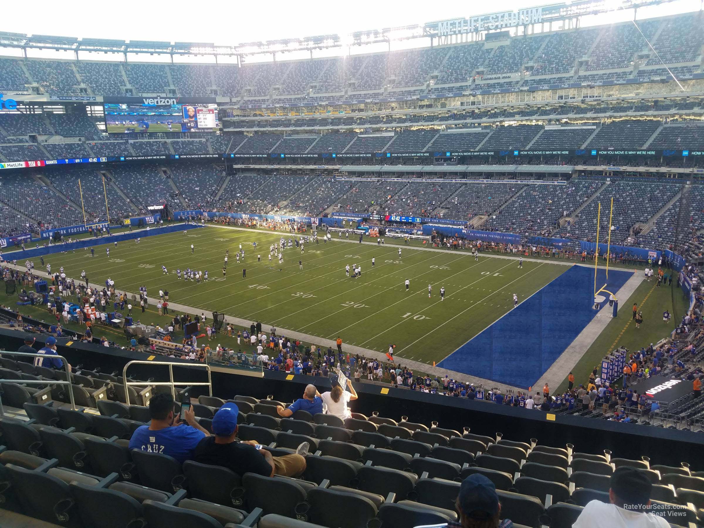 -The 200 Level at MetLife Stadium is also known as the Mezzanine Level. Fans looking at tickets in this area will have a choice between an end section and sections on the side. Side Sections Sections on the side of the 200 Level are also known as the Mezzanine Club. These seats are larger than other mezzanine seats and have direct access to the indoor club lounge. The lounge is exclusive to club ticketholders and is a popular place before concerts, at halftime of football games, and when the weather takes a turn for the worst. End Sections For a cheaper ticket on the 200 level, consider an end section. These end seats are split up into lower and upper sections. Most lower sections have an "A" in their name, while upper sections usually end in "B". The lower (A) sections hang over the 100 Level, resulting in excellent views that are closer than expected. All-in-all, we think these are some of the most under-rated seats at MetLife. One common complaint about end sections is the lack of nearby concessions/amenities. If you like to eat a lot or get up and down often, consider sitting elsewhere.