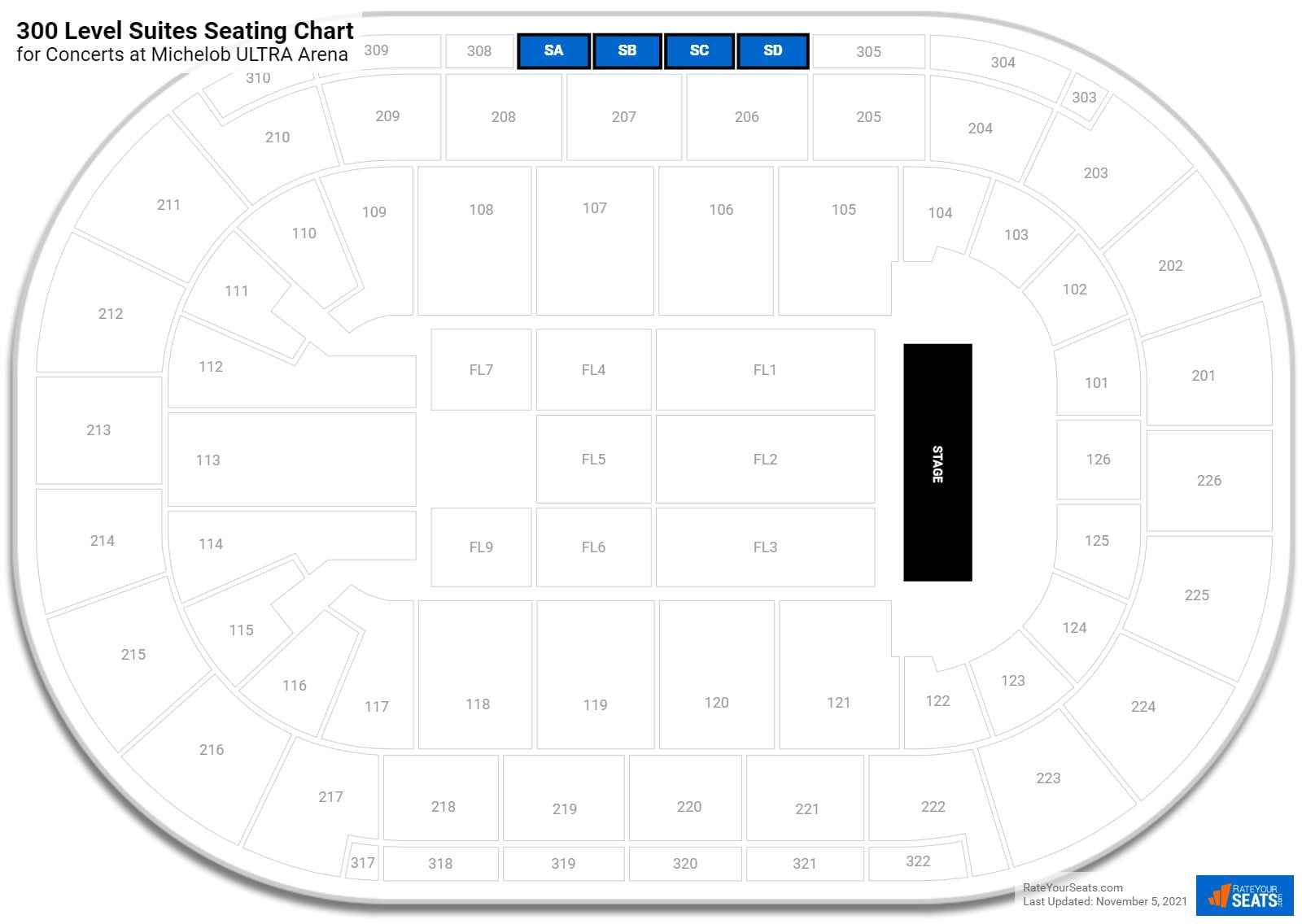 The 300 Level Suites at Michelob Ultra Arena are located between sections 305 and 308 on the stadium's upper level. Suites are labeled A-D and are sometimes referred to as Box Seats.