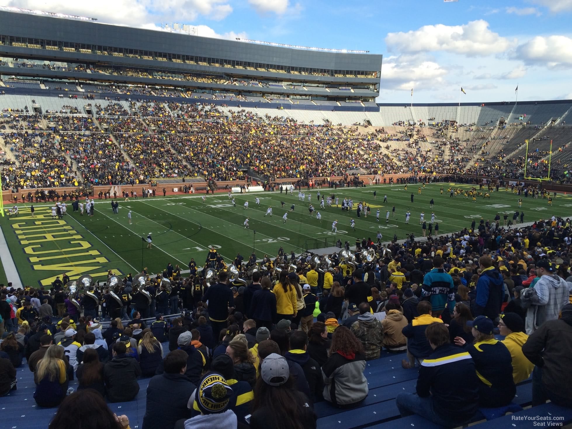 -Fans in the corner sections at Michigan Stadium will have a different experience depending on which rows they are seated. In the very front rows, the lack of elevation can make it difficult to see over the sidelines to the opposite end of the field, while the highest rows will have the furthest and least desirable views for a football game. As each section has up to 96 rows of seating, choosing a seating row is no easy task. The best elevation for viewing the game can be found near Row 20, but this leaves a lengthy walk for fans to get to the seats (entry tunnels are located at Rows 56 and 74 for Sections 5-7 and 39-41, while all other sections only have a single tunnel at Row 72). Staying in Rows 50-70 provides a safe option that combines a good view and prevents a marathon walk to get to and from the seats. The seating in all rows consists of bleacher style benches with no back support, providing a less comfortable options than some of the premium areas. Sections 27-30, and 31R are student sections in this location, where fans can expect a loud and rowdy atmosphere throughout the season.