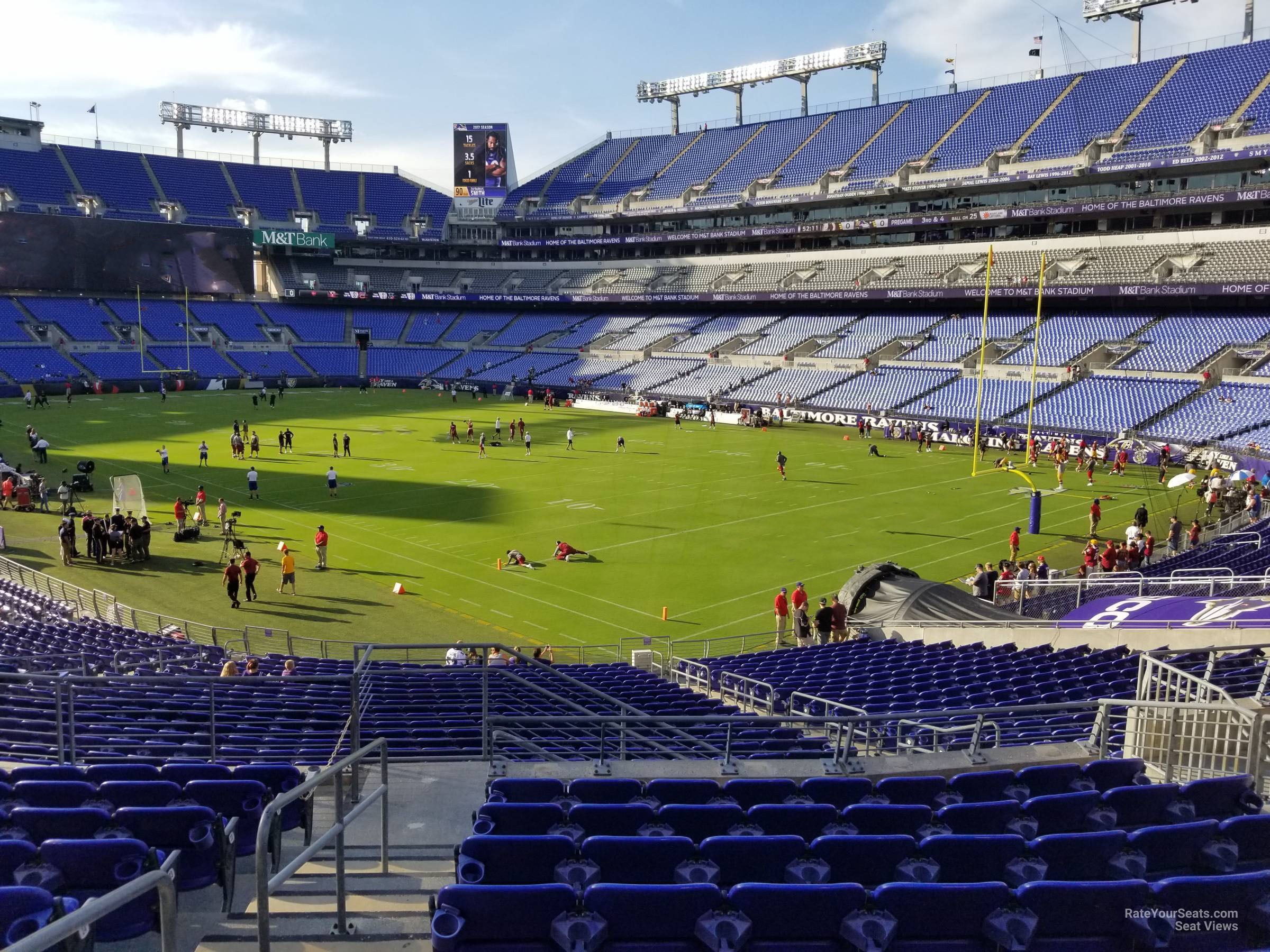 -The 100-Level at M&T Bank Stadium has perhaps the most sought-after seats due to its location close to the field. Each section in this seating level features 35-42 numbered rows of seating, with the concourse tunnel located near row 20. The tunnel essentially splits each section into an upper and lower portion. For Ravens Games To get the best overall experience, choose seats in Rows 32-40. These seats provide great elevation for seeing the entire field and don't have to worry about railings and as much foot traffic getting in the way. In sections on the north side of the field (100, 153, etc.), a small overhang covers rows 37 and above. This is an ideal place to sit if it rains or snows, but you may not be able to see punts, field goals, or long passes from the very top rows. For Concerts For the occasional concert at M&T Bank Stadium, the stage is set up in front of sections 109-117. This gives sections sections 102-103 and 124-125 a great location near the stage. All 100-Level tickets would be preferred over the much higher 500-level seats for a show.