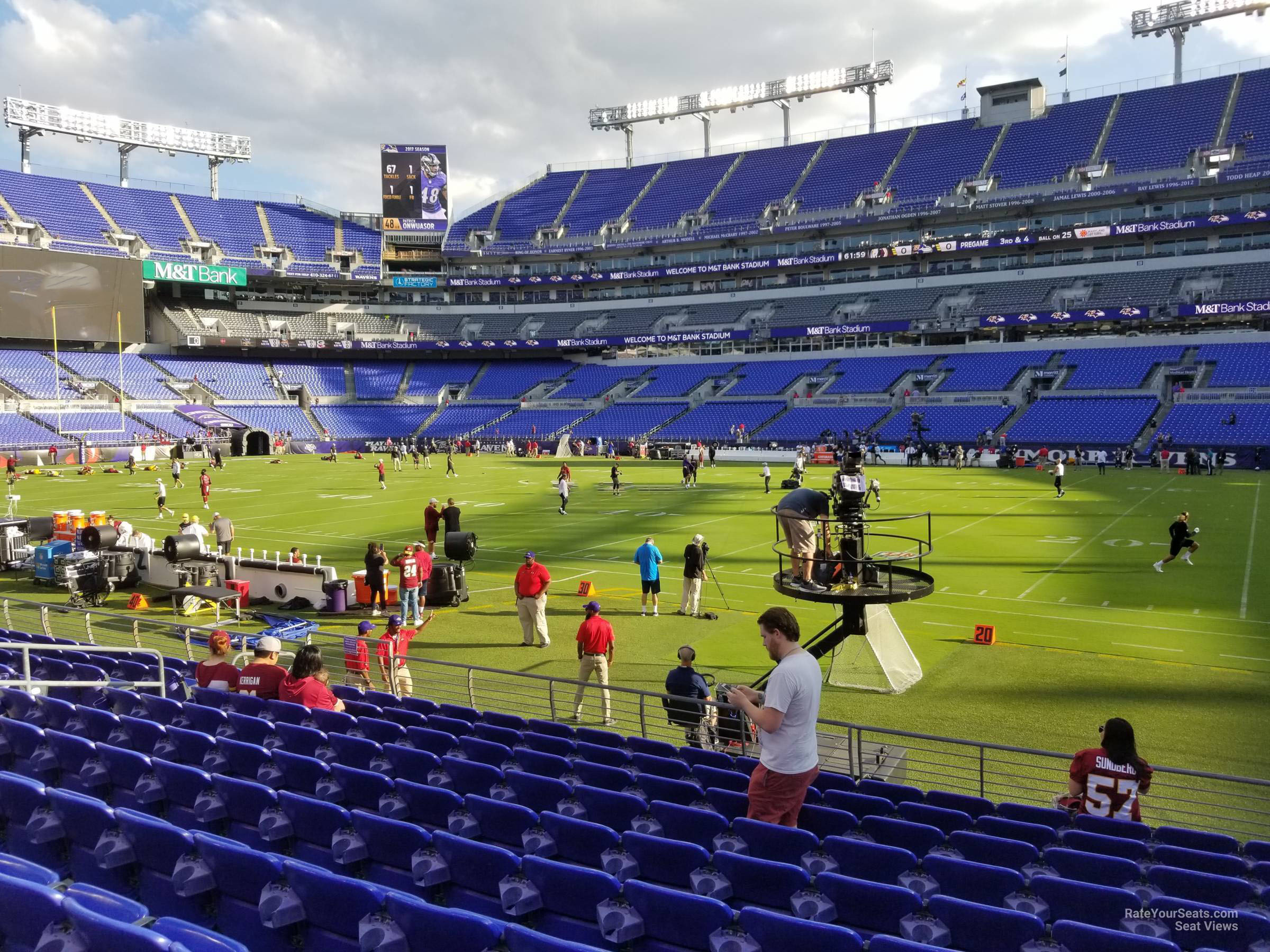 -The 100-Level at M&T Bank Stadium has perhaps the most sought-after seats due to its location close to the field. Each section in this seating level features 35-42 numbered rows of seating, with the concourse tunnel located near row 20. The tunnel essentially splits each section into an upper and lower portion. For Ravens Games To get the best overall experience, choose seats in Rows 32-40. These seats provide great elevation for seeing the entire field and don't have to worry about railings and as much foot traffic getting in the way. In sections on the north side of the field (100, 153, etc.), a small overhang covers rows 37 and above. This is an ideal place to sit if it rains or snows, but you may not be able to see punts, field goals, or long passes from the very top rows. For Concerts For the occasional concert at M&T Bank Stadium, the stage is set up in front of sections 109-117. This gives sections sections 102-103 and 124-125 a great location near the stage. All 100-Level tickets would be preferred over the much higher 500-level seats for a show.