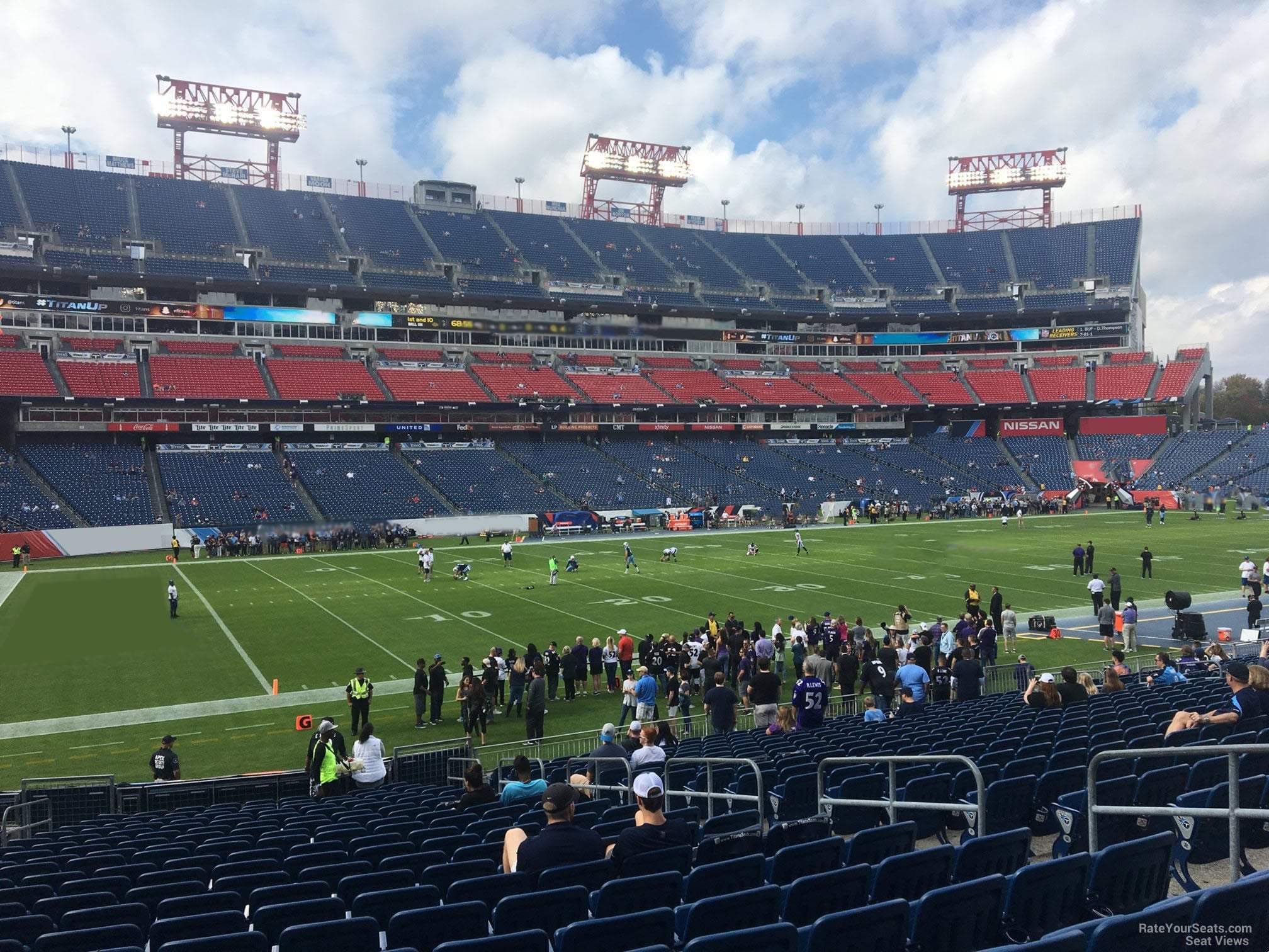 -Row and Seat Numbers 100 Level sections at Nissan Stadium each have 35 rows with row A at the front and row LL at the back. The entrance to each section is at the top row. A ticket close to this row will result in quicker trips to the concourse. As you look towards the field from your section, seat 1 is on the right aisle. Choosing Where to Sit For football games and concerts, the best seats in the 100 Level will be similar. 111-113 and 134-136 will have the best midfield views for football and the best angle towards a concert stage. For your best chance at avoiding the sun, consider sections on the 131-138 side. As the afternoon wears on, these will be the first lower level seats in the shade. This is also the Titans side of the field. For football games, double-letter rows (AA-LL) have the most comfortable sitelines and are high enough to see over the players. For concerts, lower rows are better Other Notes Above sections 101 and 146 is the party plaza - a popular hangout during Titans games Endzone sections have direct views of the videoboards
