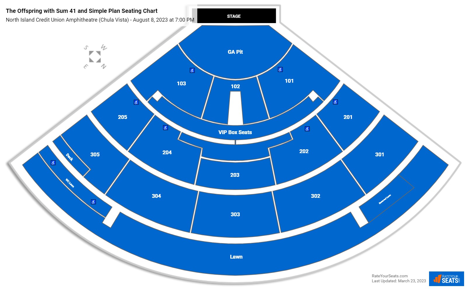 North Island Credit Union Amphitheatre (Chula Vista) concert seating charts vary by performance. This chart represents the most common setup for concerts at North Island Credit Union Amphitheatre (Chula Vista), but some sections may be removed or altered for individual shows. Check out the seating chart for your show for the most accurate layout.